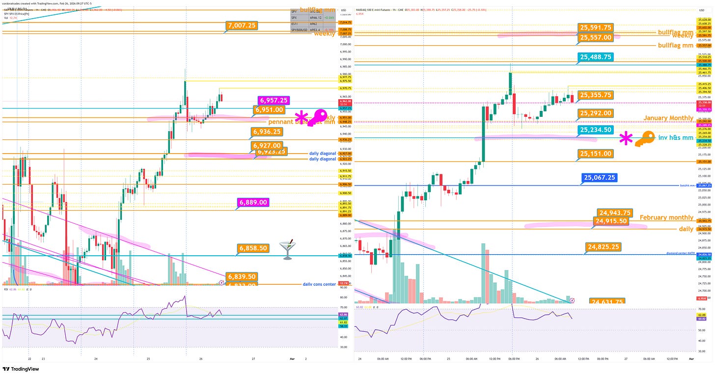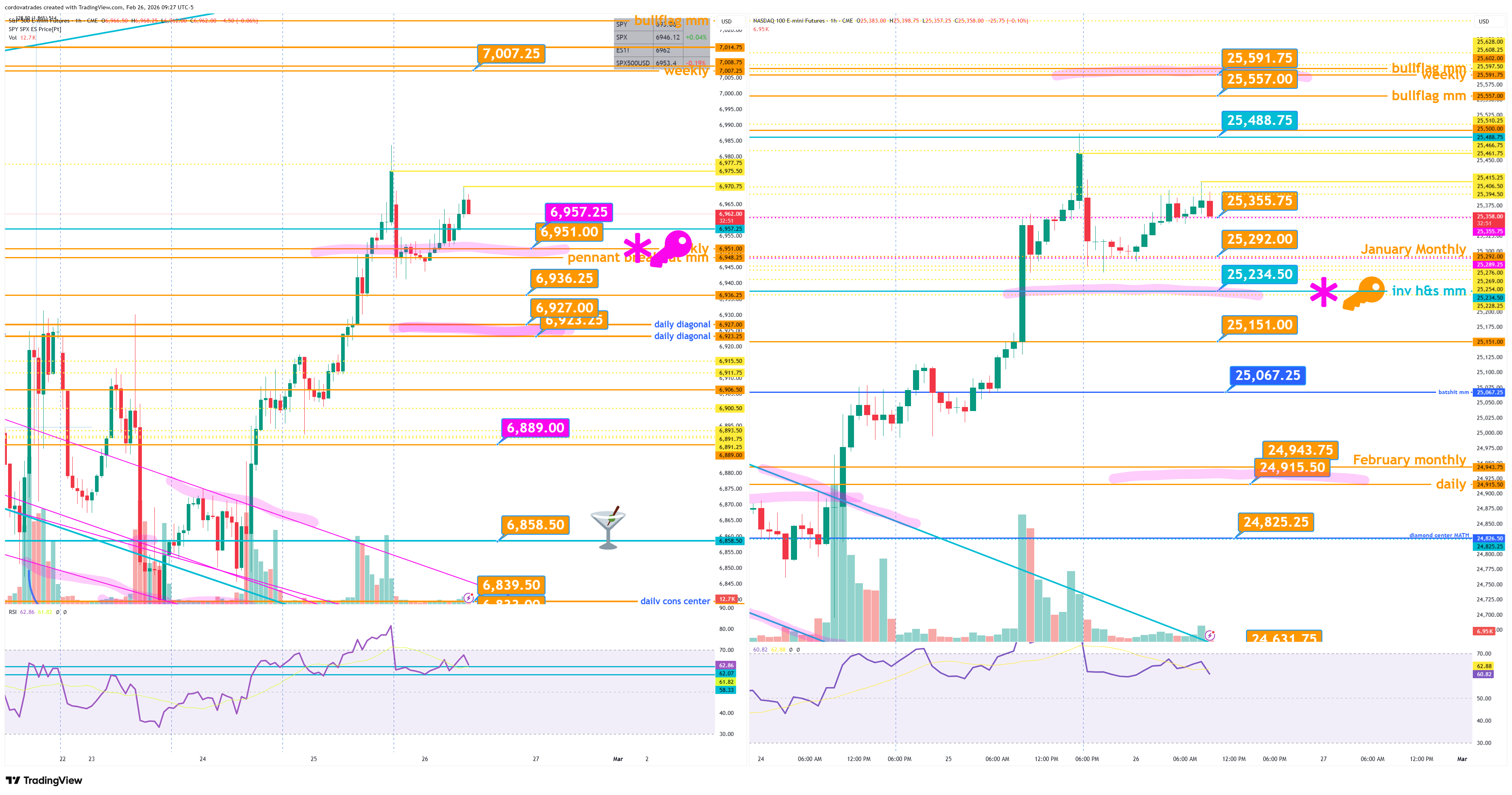 $ES now above weekly 6951.00 (key for today) and it's broken out while above. Underneath daily 6923.75-6927.00 would potentially trigger a bigger pullback. $NQ watch 25234.50 as key today. $GC pennant on 4hr. >5220.9 breakout. <5175 breakdown. $SI bullish over daily 86.120. $CL 63.69 S.