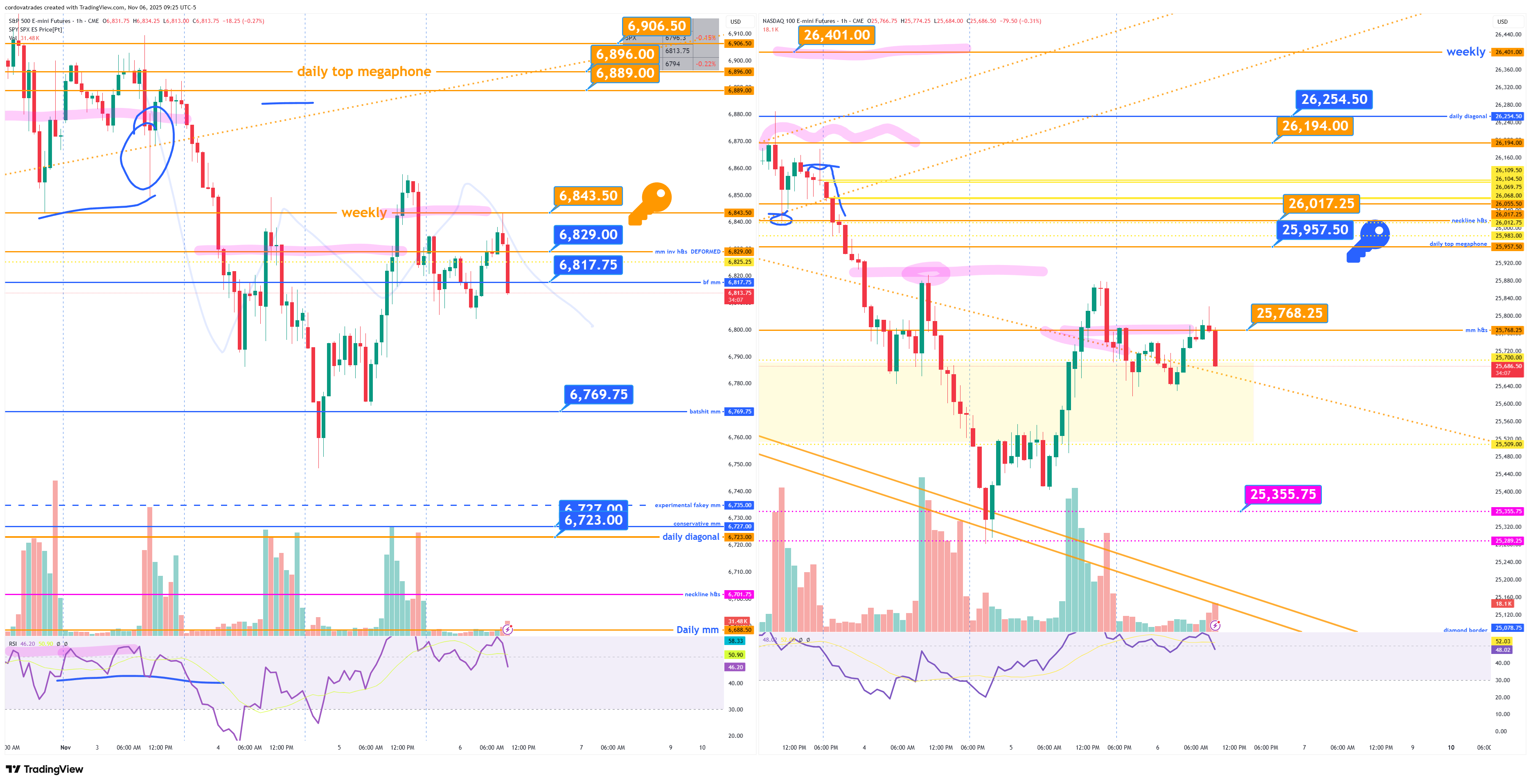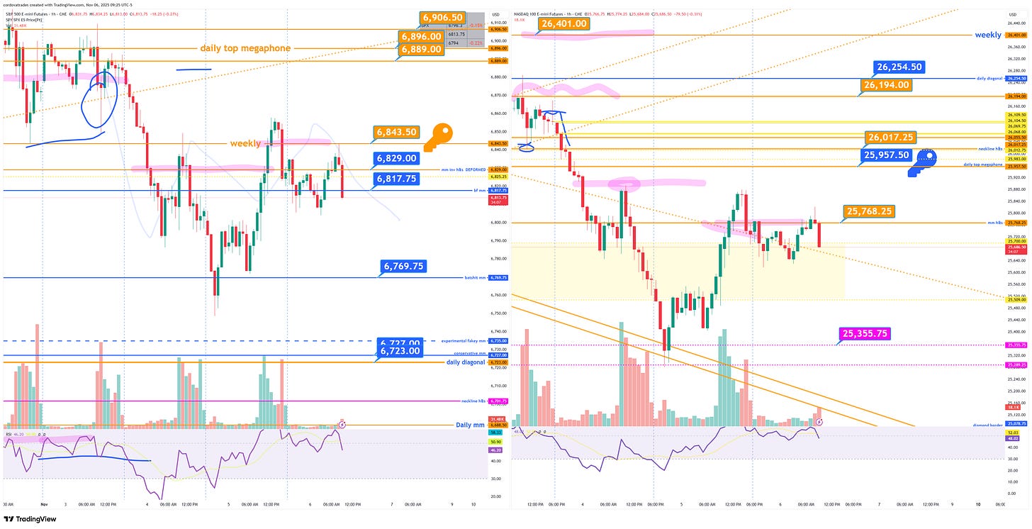 Backtest completeJulia Cordova✨Nov 06, 2025∙ PaidShareKey for today is $ES 6843.50 (weekly). We saw a break above and decline yesterday in the last hour and a backtest in the 8am hour. While we are below there I have shorting bias. $NQ 25957.50. $GC wide range chopping. $CL 58.85 4hr support.This post is for paid subscribersSubscribeAlready a paid subscriber? Sign in