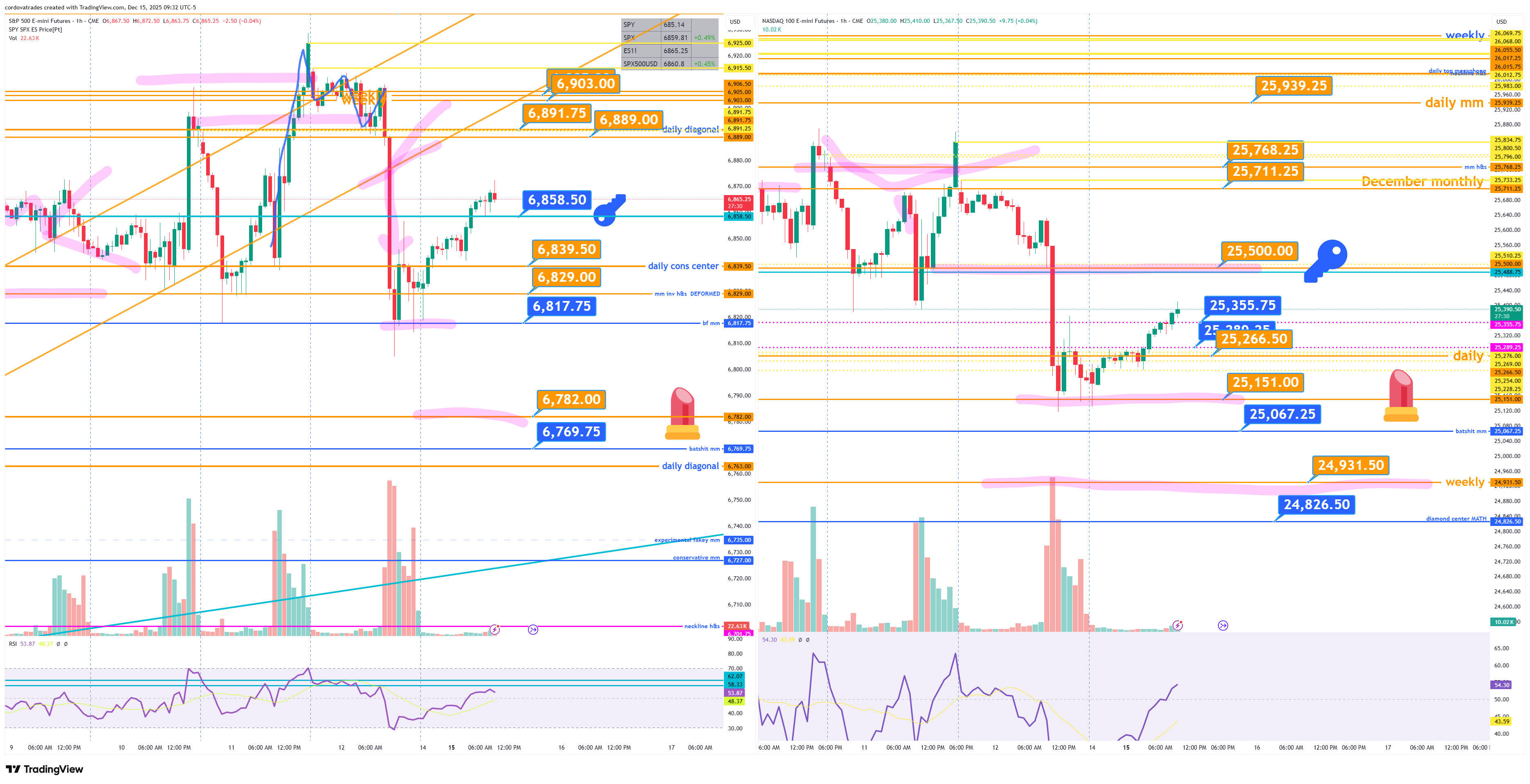 Blue Monday PlanJulia Cordova✨Dec 15, 2025∙ PaidShareNo contract roll for TradingView yet. All levels remain the same. For today watch 6858.50 as the key. Next R 6889-6891.75. S=6839.50. $NQ key is 25500. Watch $GC 4367.7 R & $SI 63.50 S. $XOP 129.82 S.This post is for paid subscribersSubscribeAlready a paid subscriber? Sign in