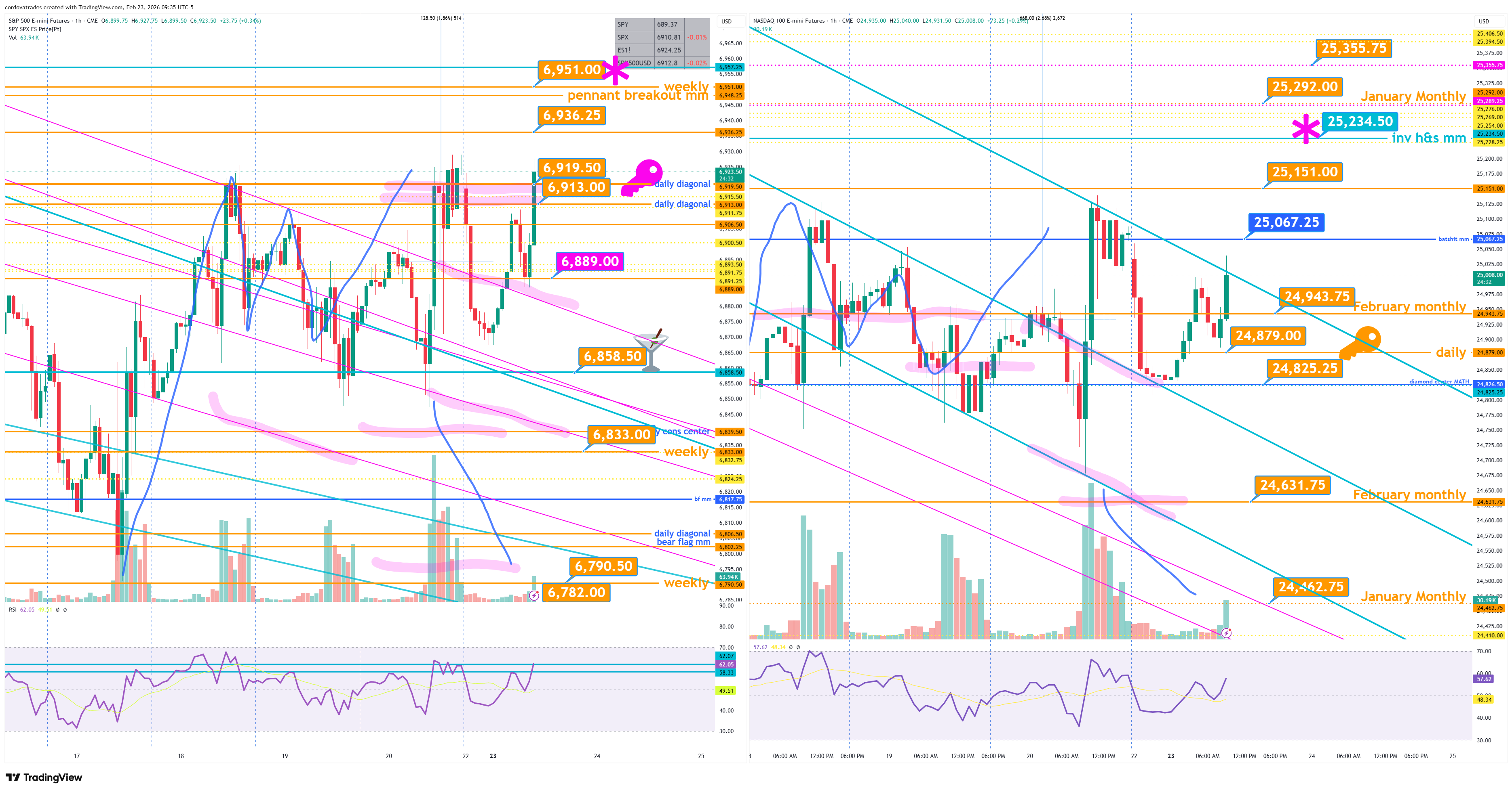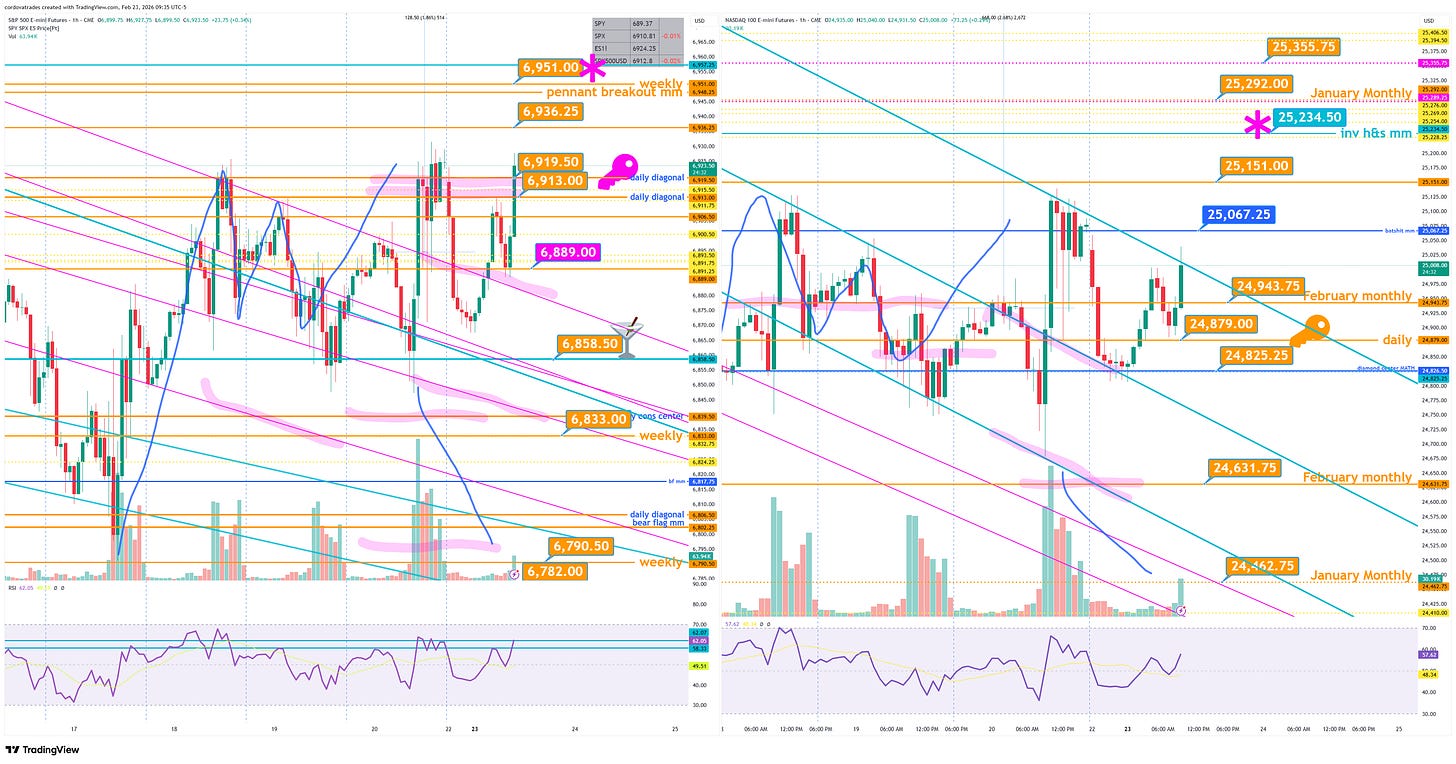 Blue Monday PlanJulia Cordova✨Feb 23, 2026∙ PaidShareGap down and volatility for indices overnight. Key for today is $ES 6913-6919.50 (daily). $NQ 24879. $GC 4hr R 5207.1. $SI daily pit close over 86.12 = inv h&s breakout daily timeframe. $CL 65.65R.This post is for paid subscribersSubscribeAlready a paid subscriber? Sign in