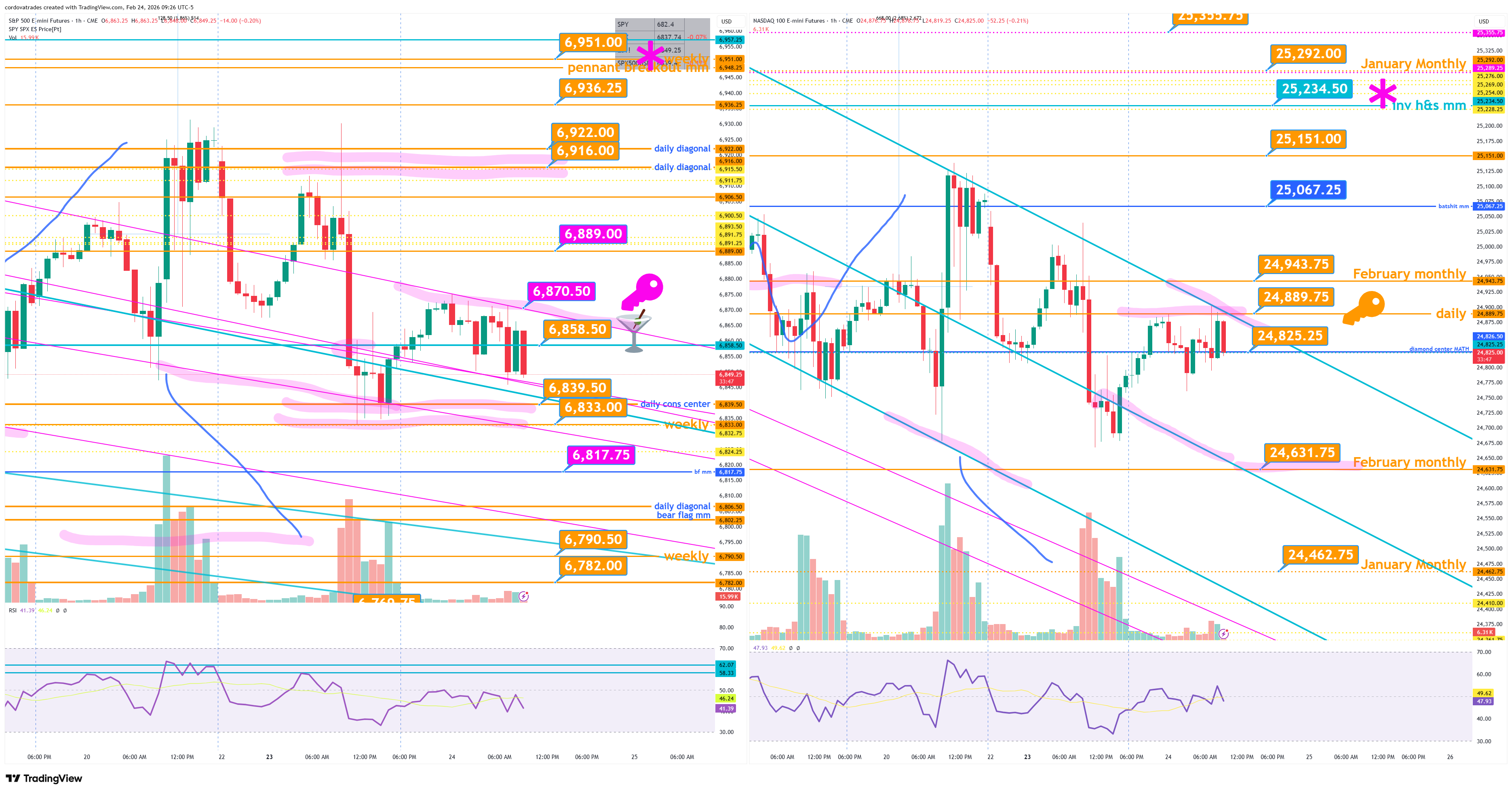 Yesterday $ES got a significant bounce from the 6833.00 weekly key. Once again, that level is important to watch as the bigger picture. Today I have assigned the intraday key as 6870.50 (descending each hour.) $NQ 24889.75 (daily) is key. Watch for $GC 5078.7 weekly key backtest. $SI 85.325 hourly support. $CL 65.65 $XOP 148.52