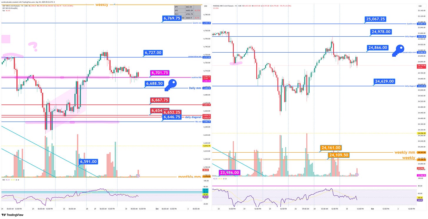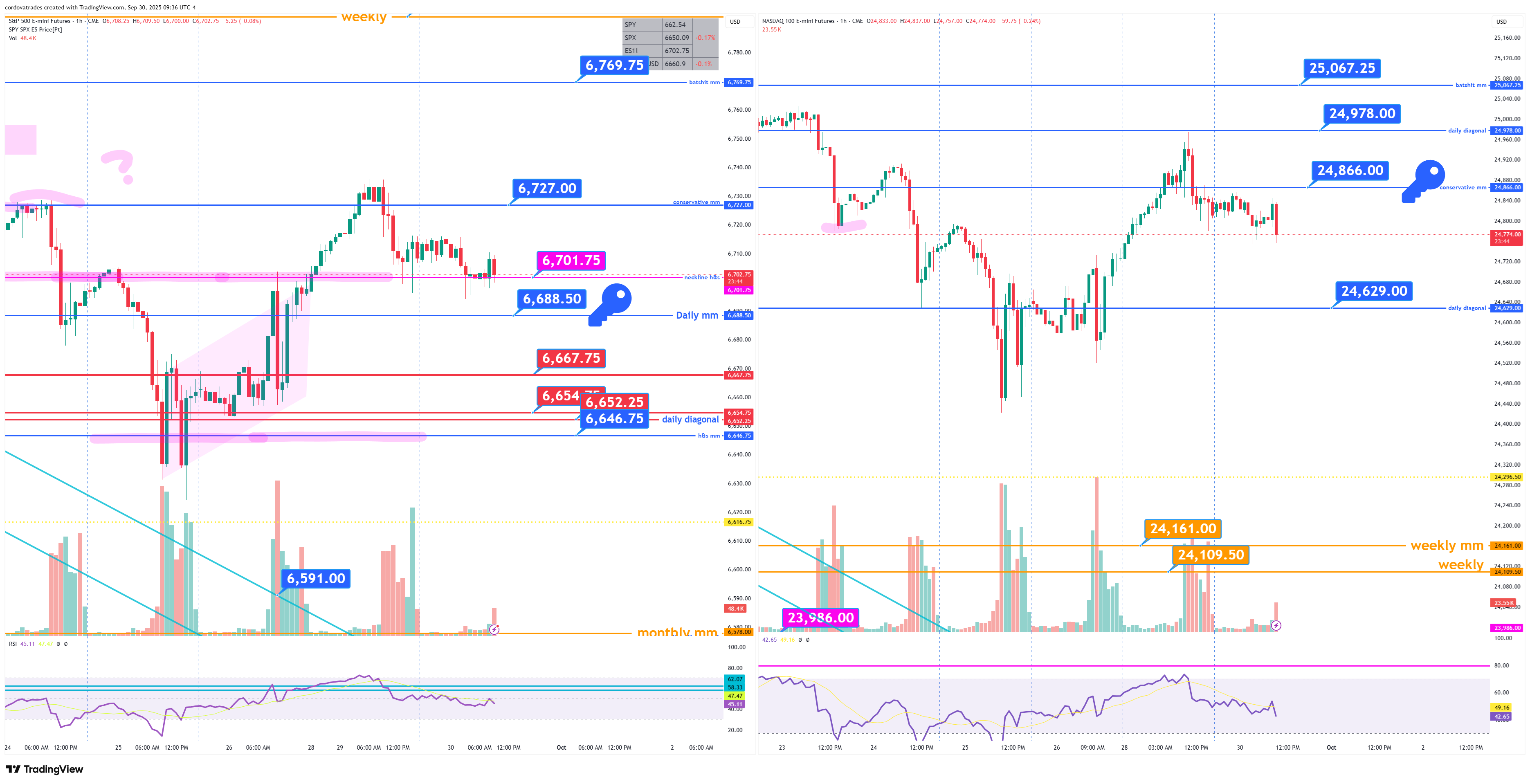 Both $ES and $NQ are bull flaggy looking on the hourly timeframe. I will draw in the flags ASAP on Discord. $ES key 6688.50, $NQ 24866. Metals dropped overnight. $GC 3826.8 support important. $SI 47.345 daily R. Watch for oil to breach 51.42 (then 60.79 gap fill?) or back over 63.69.