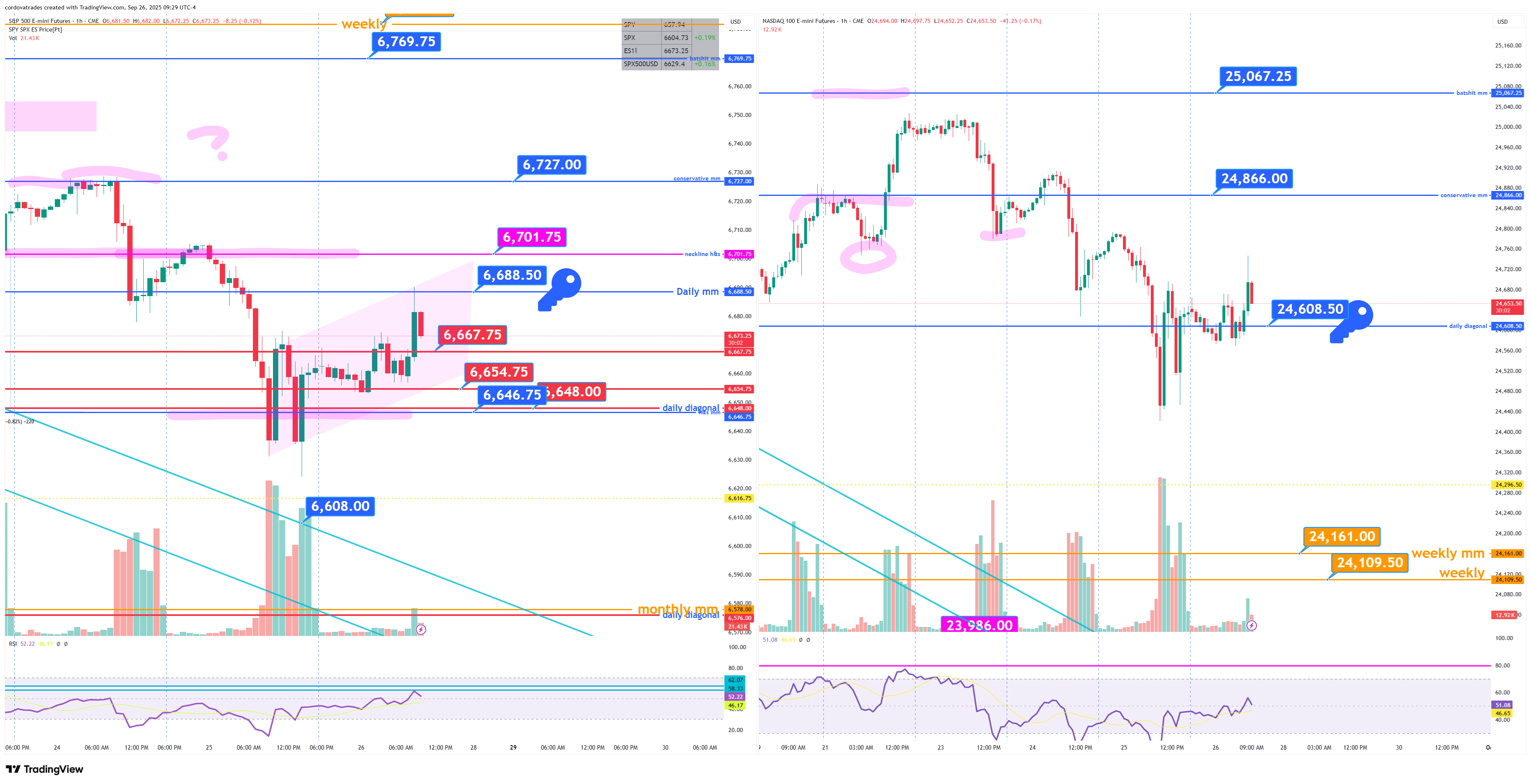 Flagging FridayJulia Cordova✨Sep 26, 2025∙ Paid2SharePotential bear flagging on both indices, but the flags are more ‘squinty’ and less clean. Watch 6688.50 as the $ES key today. $GC 3782.6 hourly support. $CL watch 65.26 and over 65.65 is a big whoop.This post is for paid subscribersSubscribeAlready a paid subscriber? Sign in