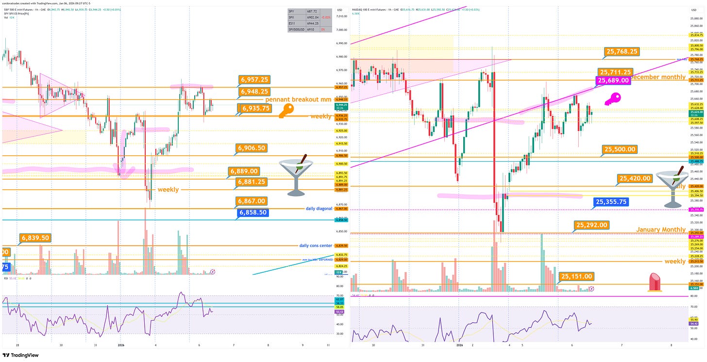 Indices flaggy overnight. Same keys as yesterday for $ES : 6935.75 (weekly) & $NQ 25689 (hourly and ascending). $RTY R 2568.5 on daily bullflag. $GC mm 4544.8 from inv h&s. if loses 4448.6 could downdraft. silver broken out over 75.99. R=79.755. $CL R 59.86