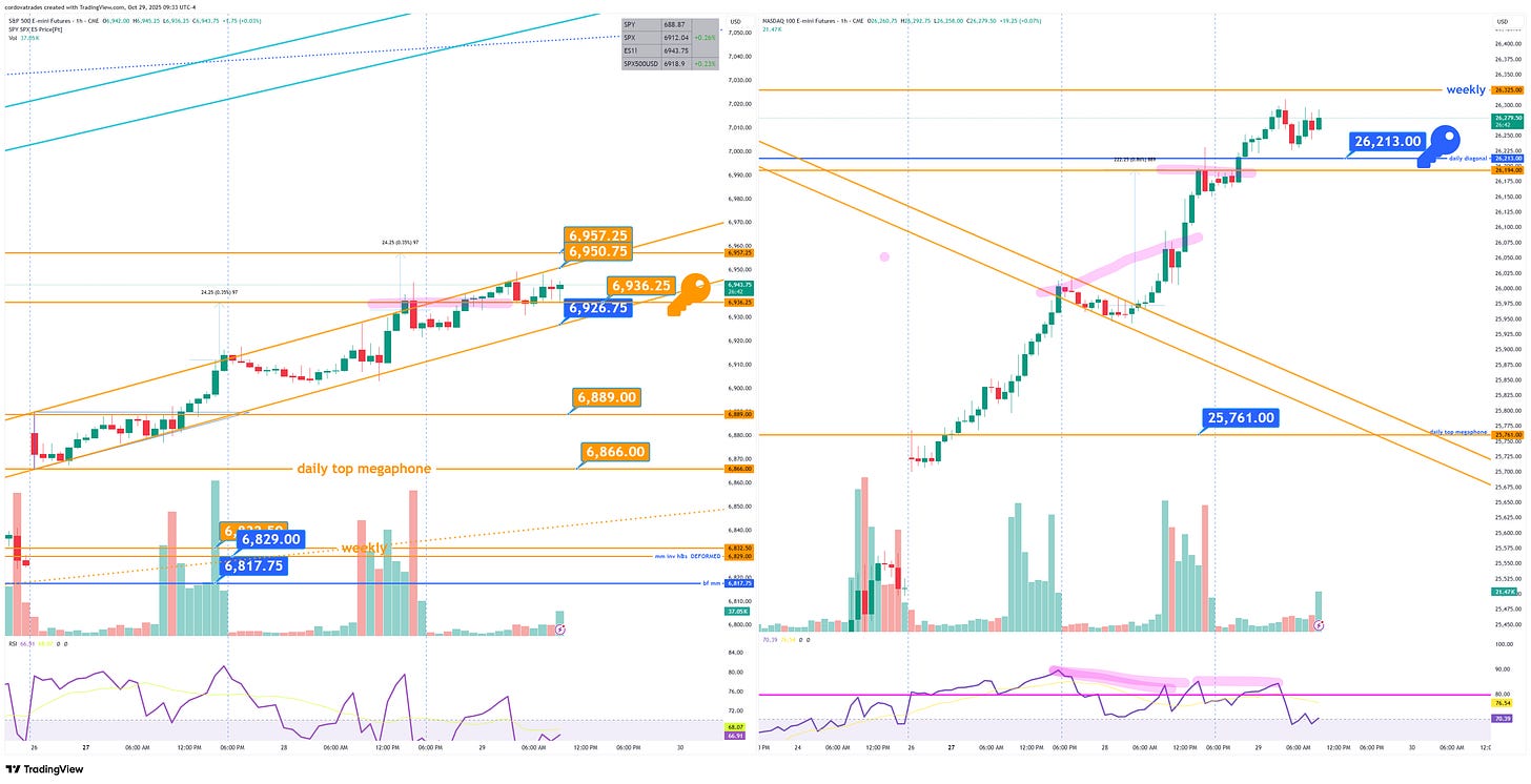 $ES continues to grind up in its upward channel. It’s potentially flagging here. Key for today is 6936.25, where I shorted yesterday. Generally we see price move one direction into 11am on FOMC day and then reverse, but let’s see if today repeats. $GC looks bullflag 1hr. 4024.3S. $CL 61.06
