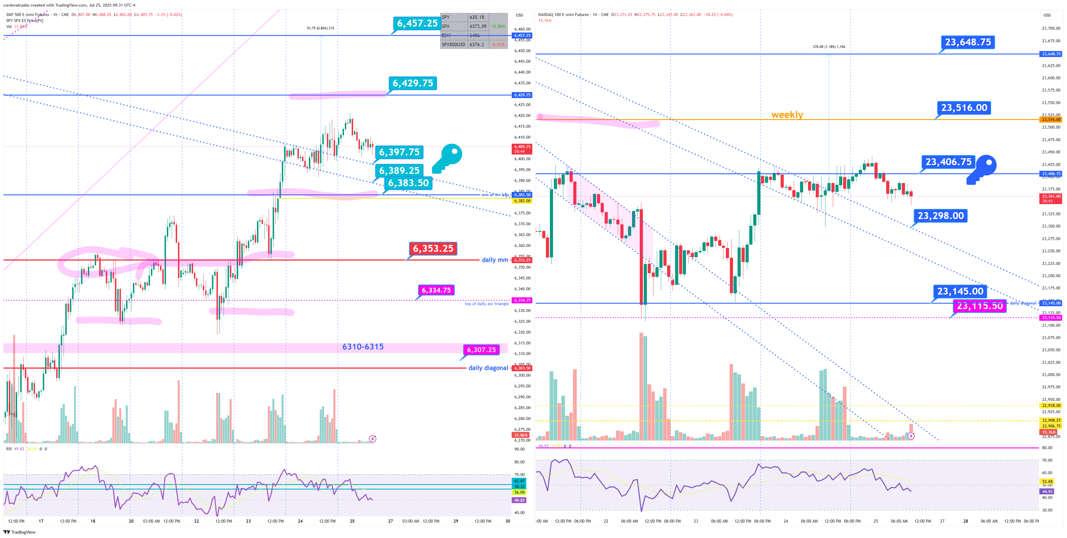 Indices chopping upwards and in a neutral zone to start today. I have assigned $ES 6397.75 (top of hourly flag channel and descending) as the key for today. $NQ 23406.75. $GC 4hr support 3334.8. $SI 39.05 4hr key (ascending). $CL (still) looks bullish over 65.65.