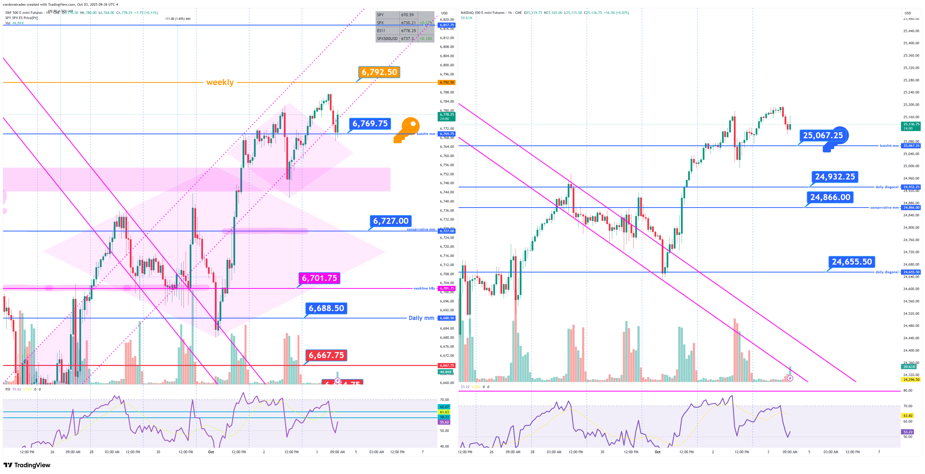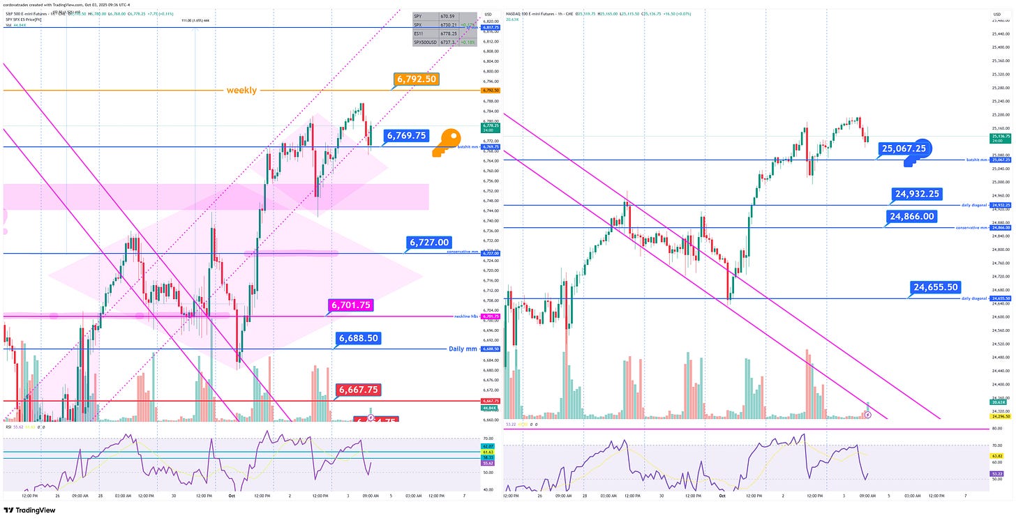 Indices at 6769.75 support (key for today) to start. An hourly close below 6755 (top of rectangle) probably starts a flush to 6727. Otherwise weekly R 6792.50 is weekly R. $GC support 3891.8 (4hr) . Silver support 47.345(daily). If $CL can maintain daily close over 61.06 could look bottomy, but Friday price action usually not definitive.