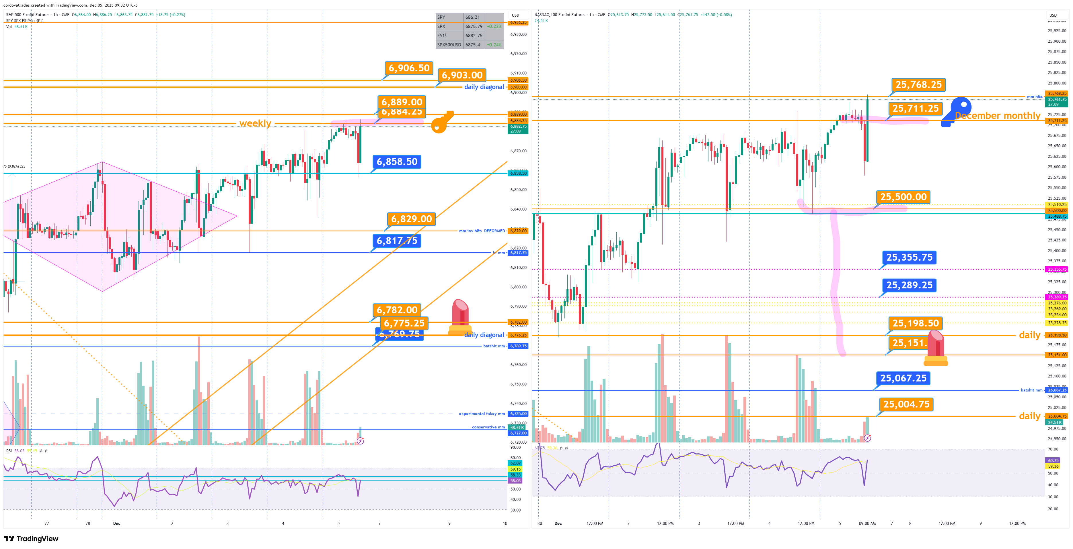 $ES and $NQ both tested yesterday’s IMPORTANT key levels overnight and those are the keys again today. $ES daily/intraweek key is 6884.25. $NQ December monthly 25711.25 is key. $GC 4hr breakout over 4260.4. $SI possible h&s on hourly. If so, near top of second shoulder now. $XOP breakout > 135.66