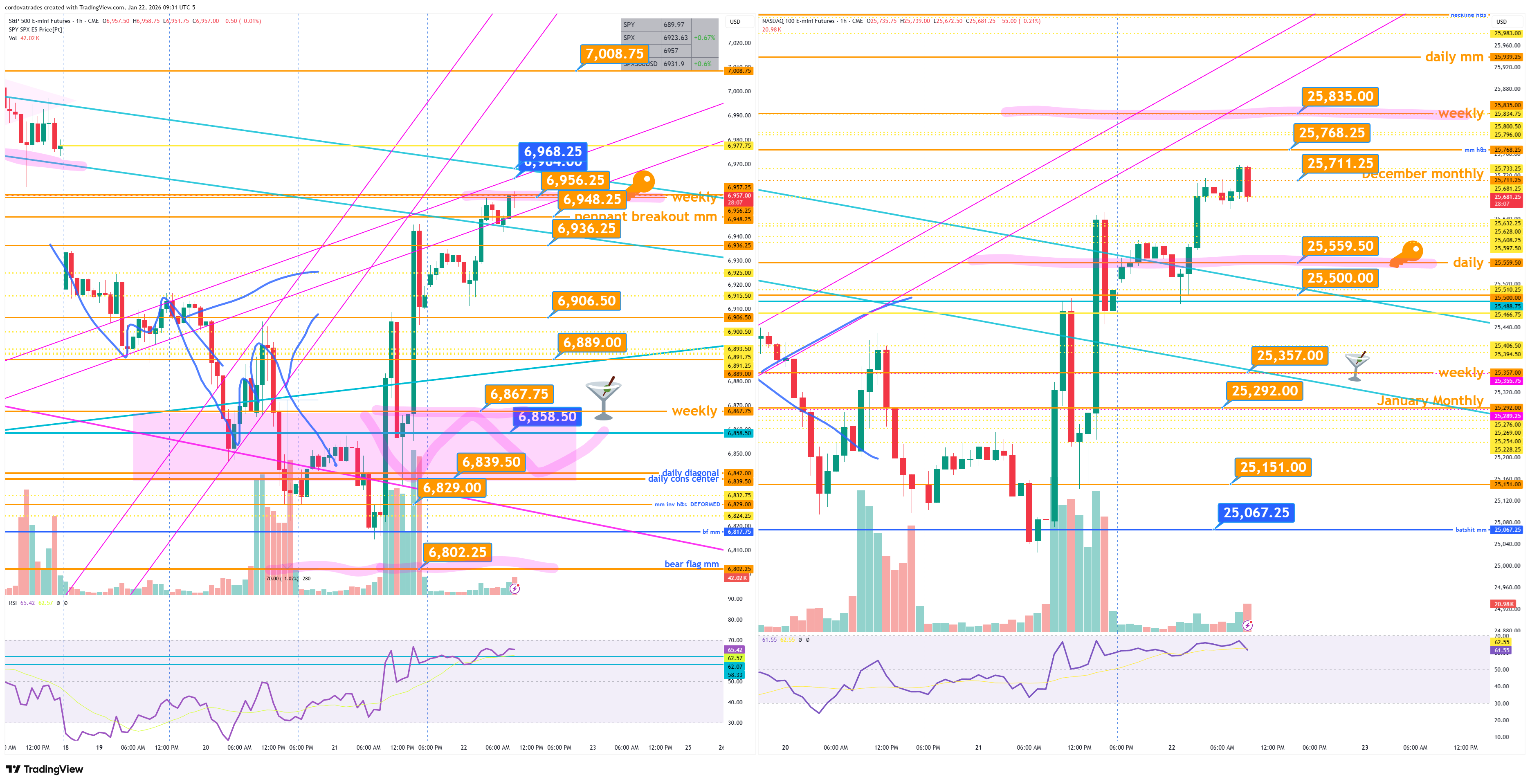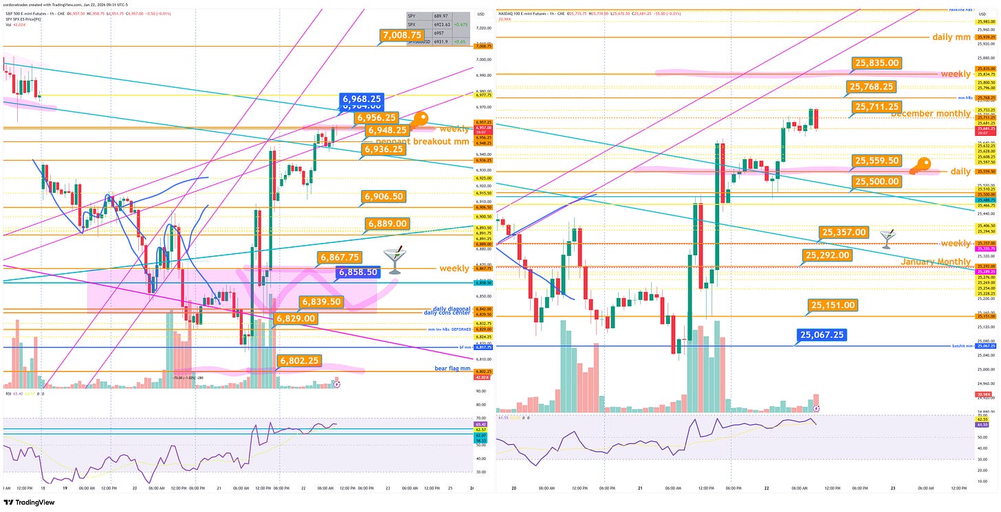 Overnight buying presents a big gap up for indices. $ES 6956.25 weekly VERY important for bulls today. $NQ bears need back below 25559.50 daily. $GC large 1hr triangle. 4841 4hr R. $SI still below daily 95.195 (I like shorts while below). $CL 59.05 S.