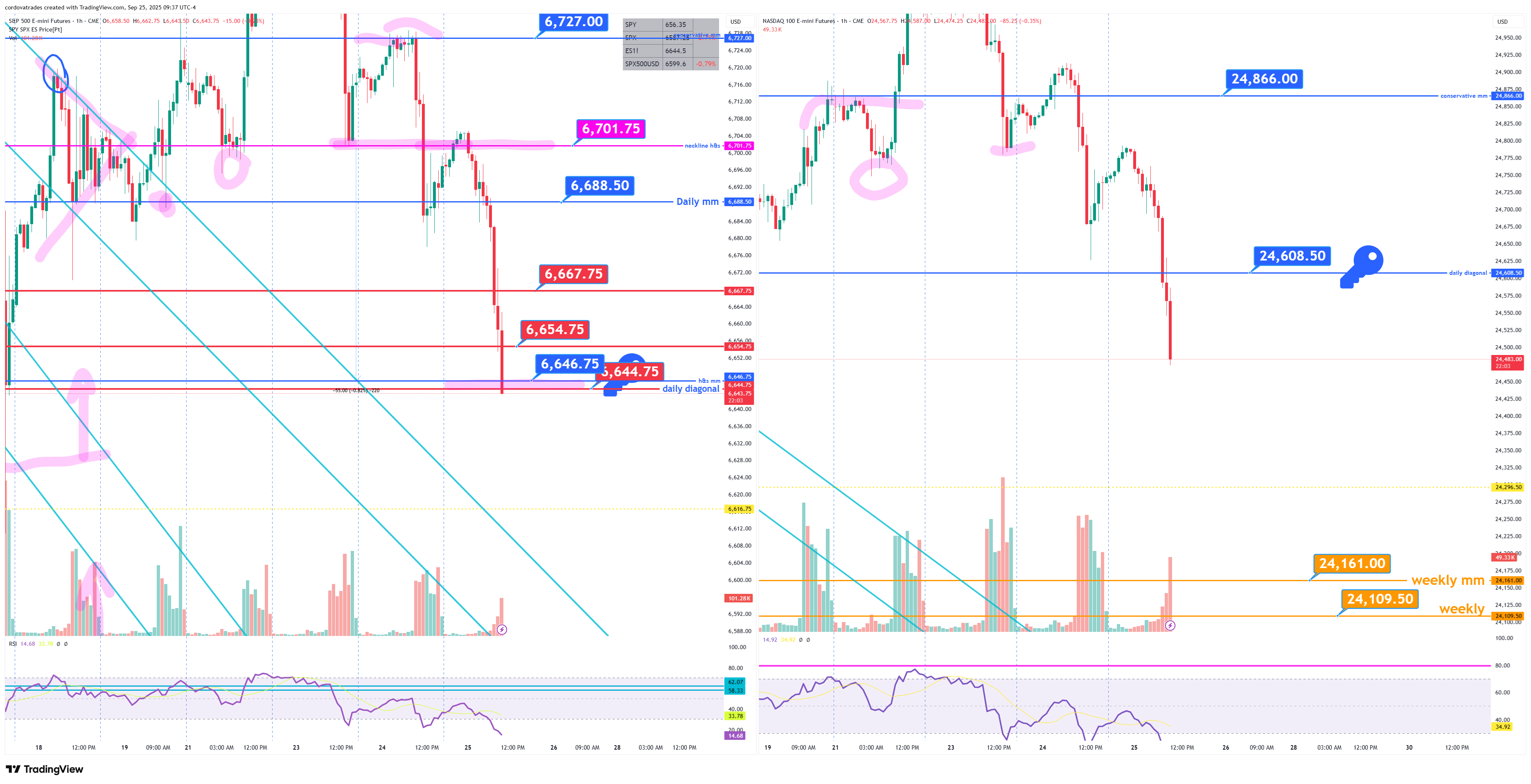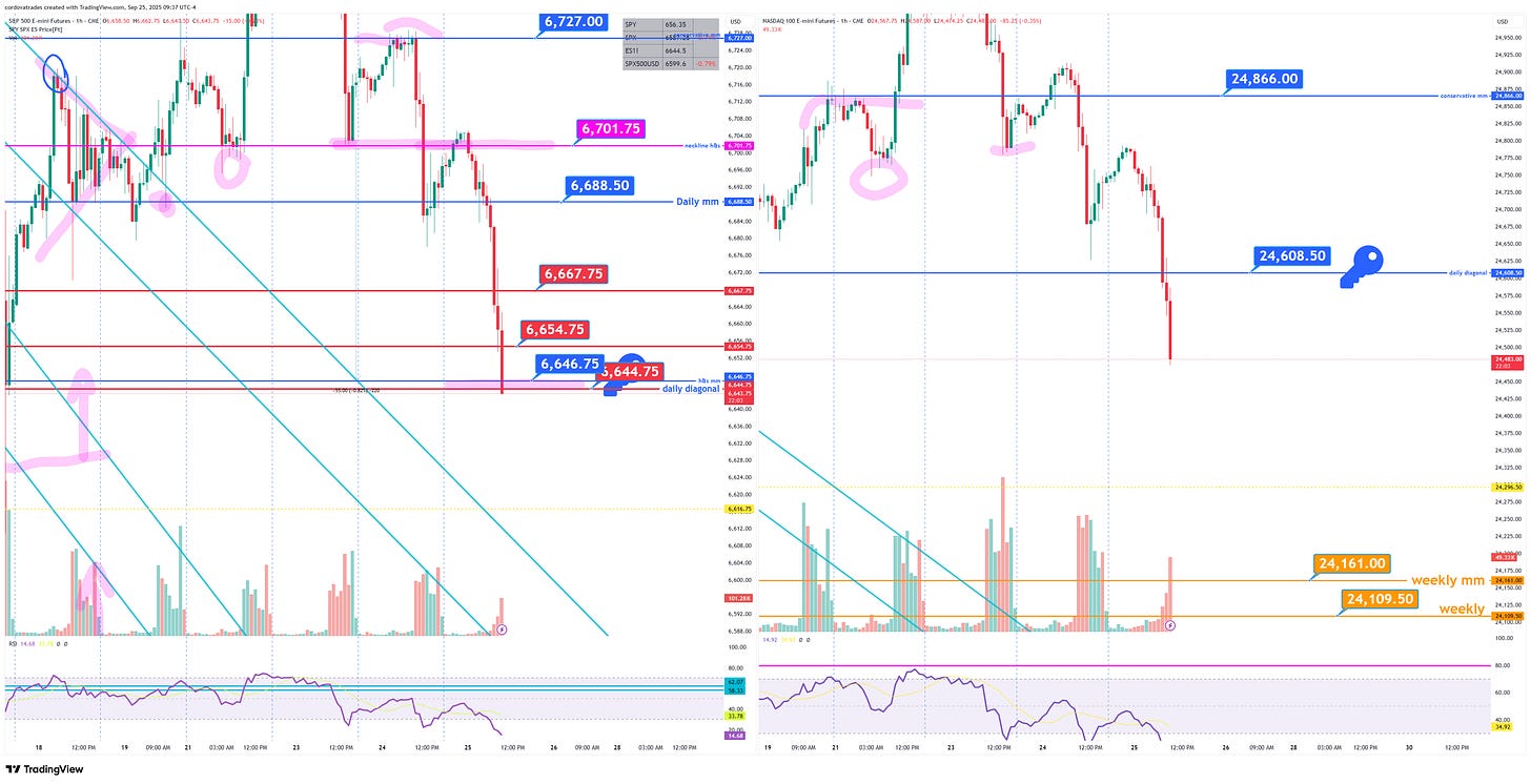 H&S target acquiredJulia Cordova✨Sep 25, 2025∙ Paid3ShareFollow through on the $ES h&s yesterday with a measured move of 6646.75(key for today) with daily support just under. Metals spike last night, but have come back down. watch $GC 3762 hourly S. $CL 63.69SThis post is for paid subscribersSubscribeAlready a paid subscriber? Sign in