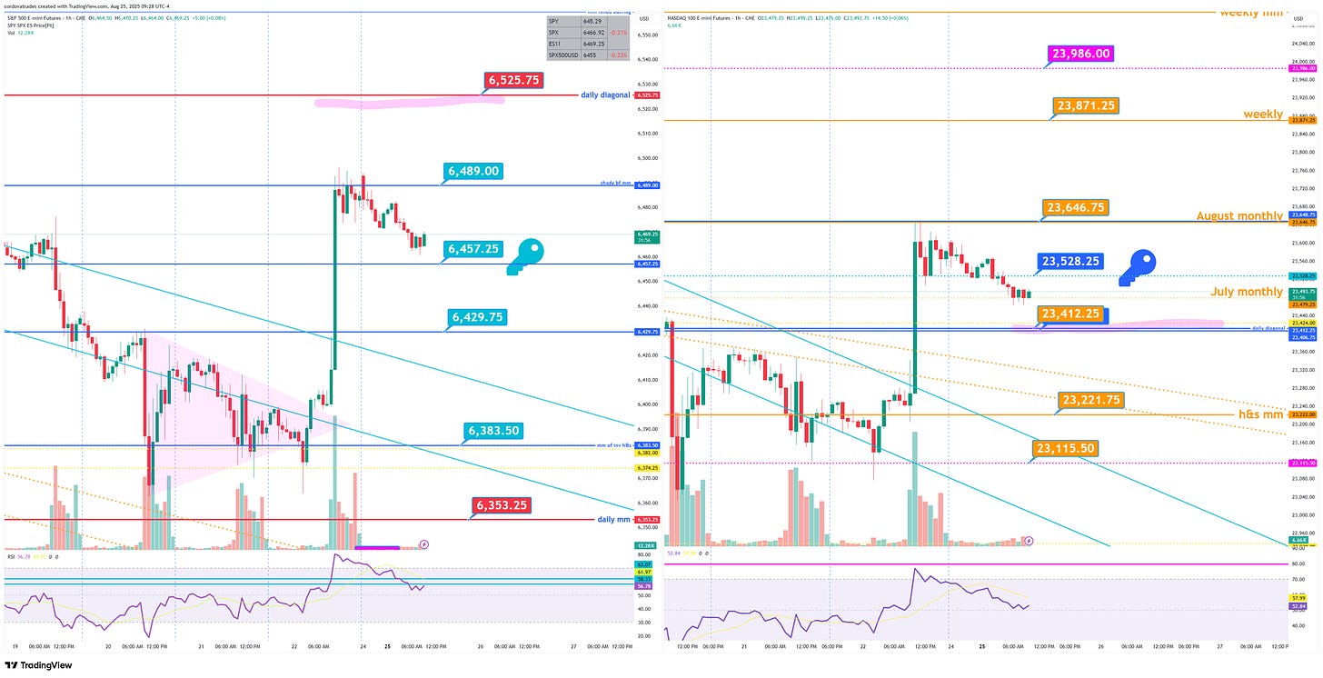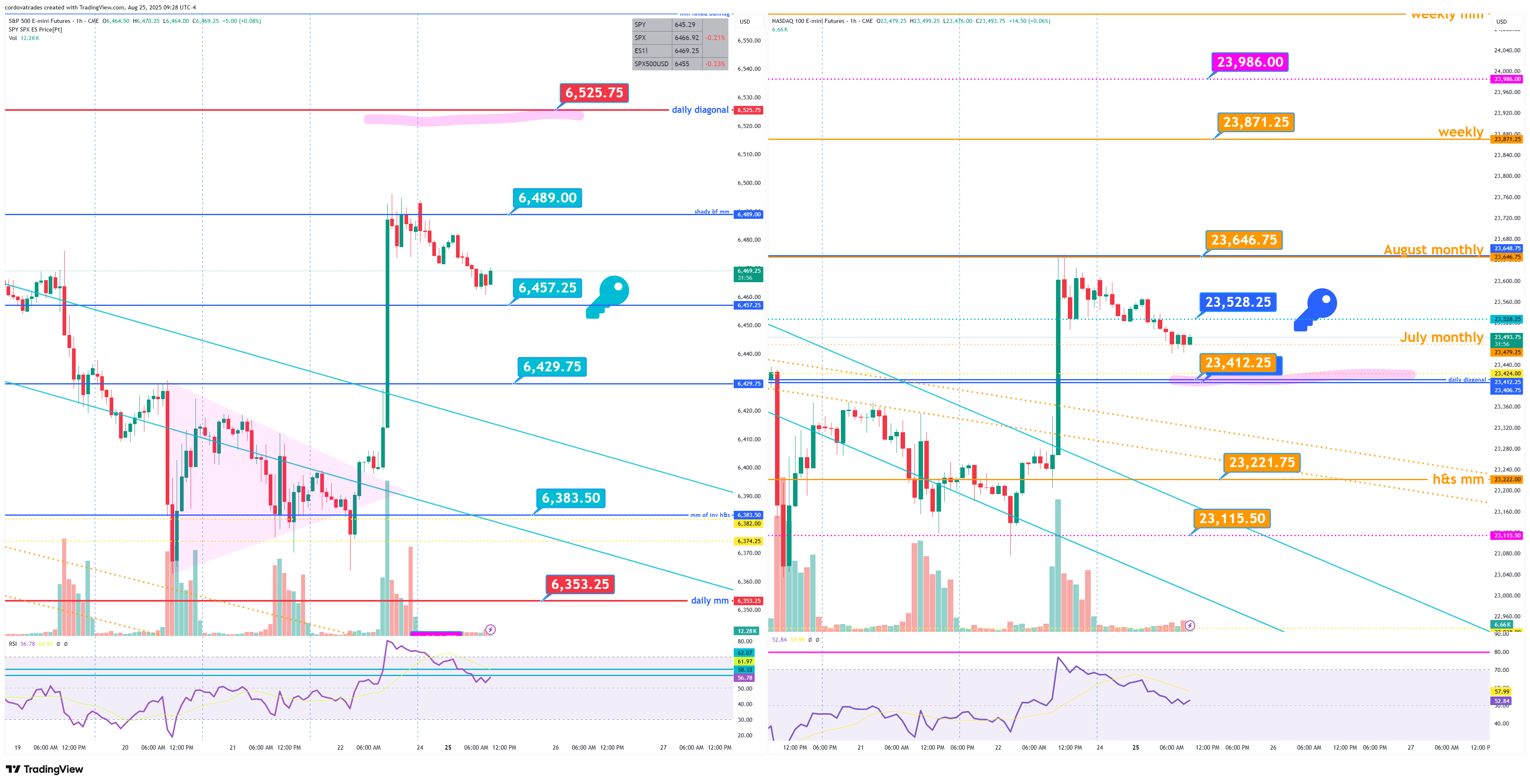 Downward chop overnight and I believe both $ES and $NQ are looking 'flaggy.' I have assigned 6457.25 as key for $ES and put the key slightly higher for $NQ bc it has something to prove. Watch 3421.9 (4hr) resistance for $GC, 3405.3 hourly support (also looks flaggy). $CL trying to breakout over 64.24.