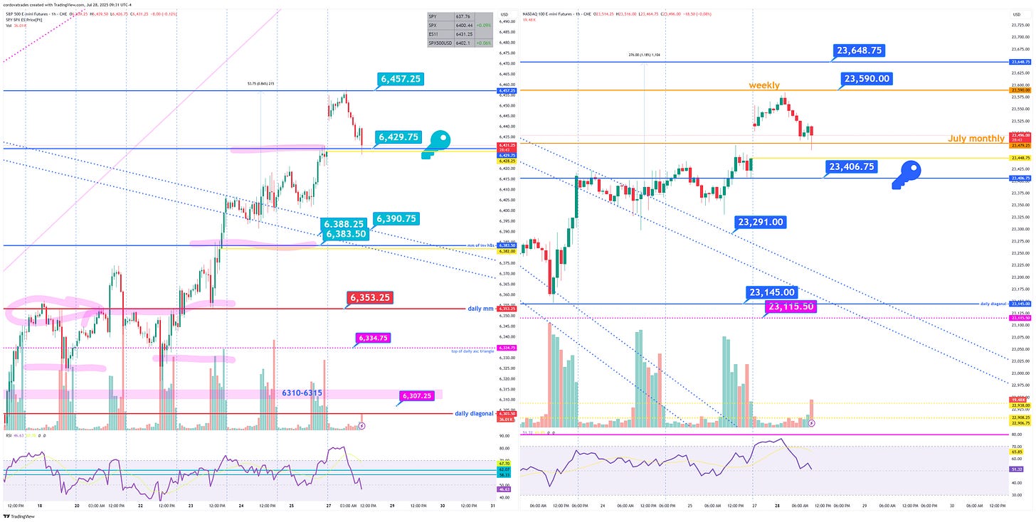Monday planJulia Cordova✨Jul 28, 2025∙ Paid31ShareGap up for indices overnight and now backtracking to close to the close. $ES key today 6429.75. $NQ 23406.75. $GC watch 3323.1 (hourly but v important). Silver held the important 38.09(hourly) so far. $CL bull over 65.65.This post is for paid subscribersSubscribeAlready a paid subscriber? Sign in