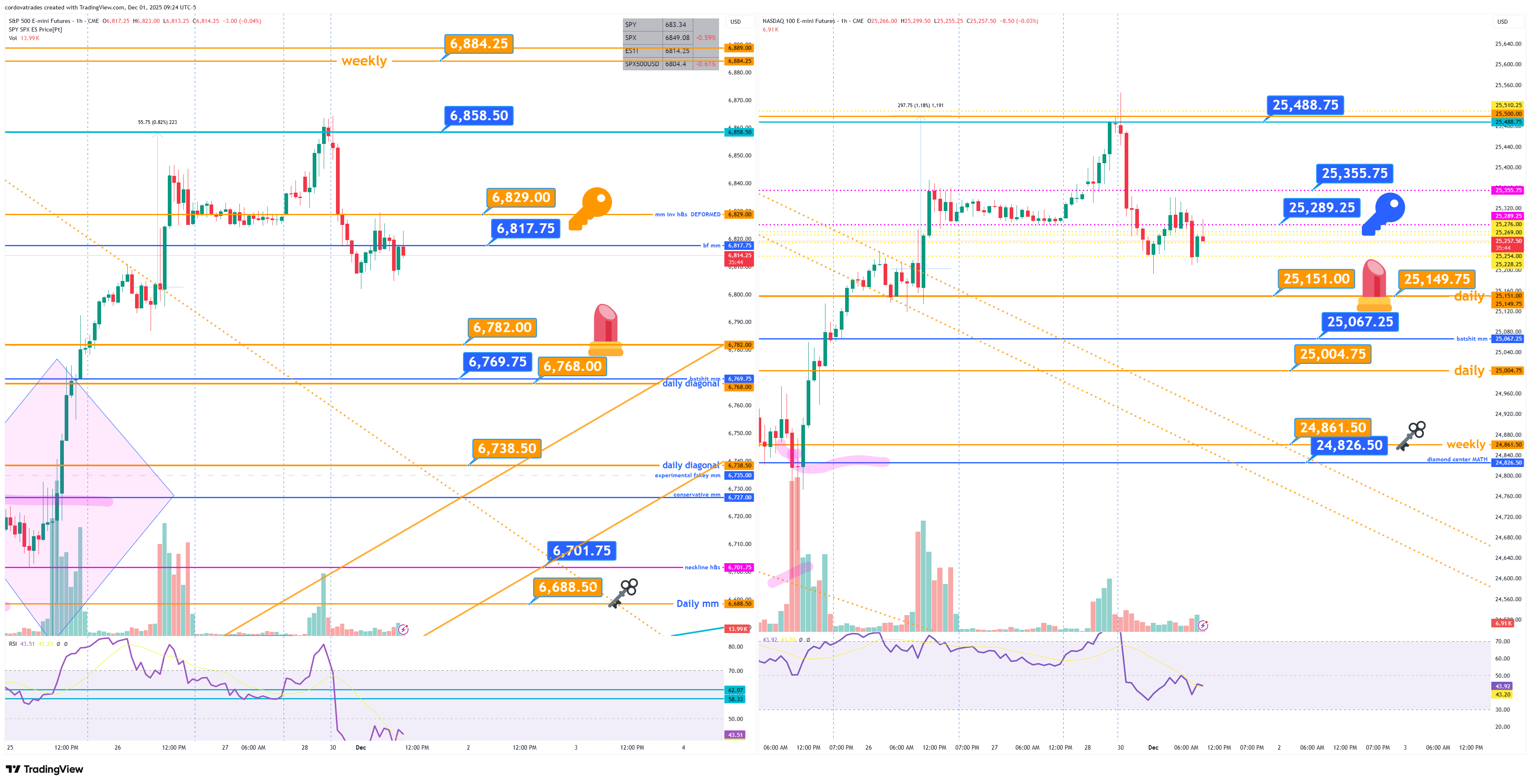$ES opened near the measured move from the mini flag (6858.50) and lost some of the holiday stuffing overnight. Key for today is 6829. Unclear if bear flag forming yet. Metals still in rally mode, but both look like pennants smaller timeframe. 57.515 $SI support on daily.