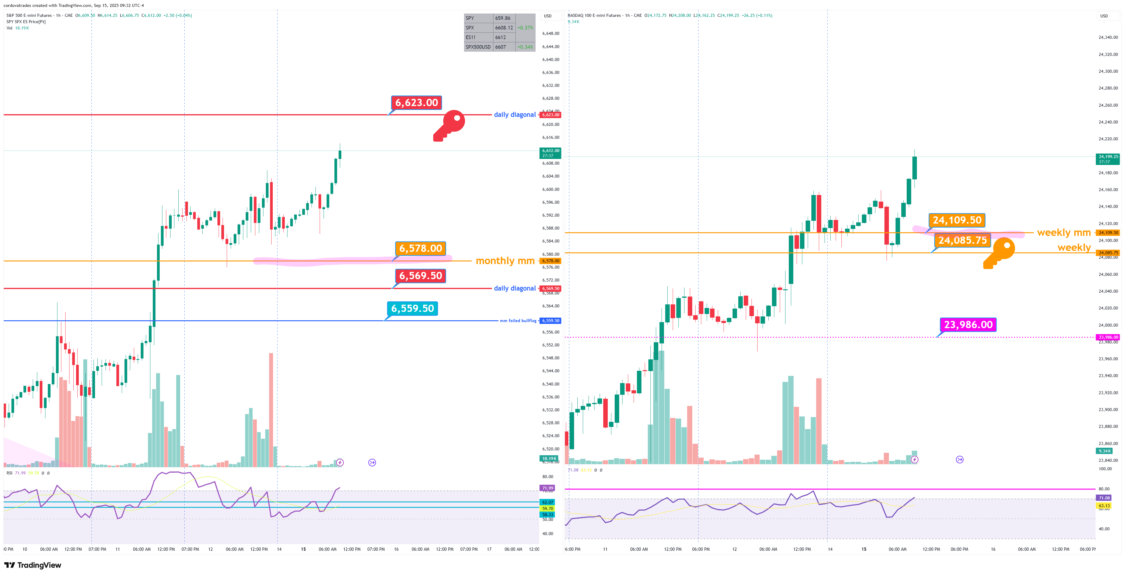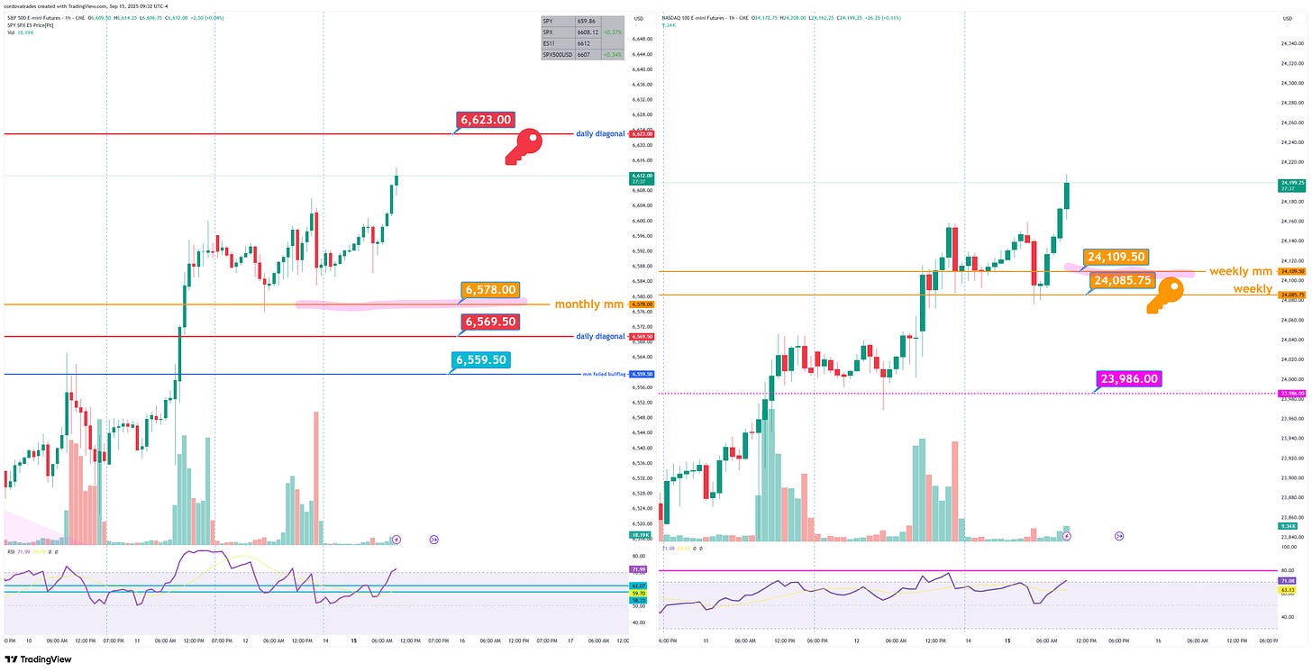 Monday Plan pre-contract rollJulia Cordova✨Sep 15, 2025∙ Paid2ShareDespite 3 pts of confirmed bearish divergence on $ES daily, the indices grinded more upwards overnight. I am watching 6623(daily) as the key today. $NQ only bearish under 24085.75. $GC 3686.4 (4hr) key. $SI 42.630(4hr). $CL 63.69 RThis post is for paid subscribersSubscribeAlready a paid subscriber? Sign in