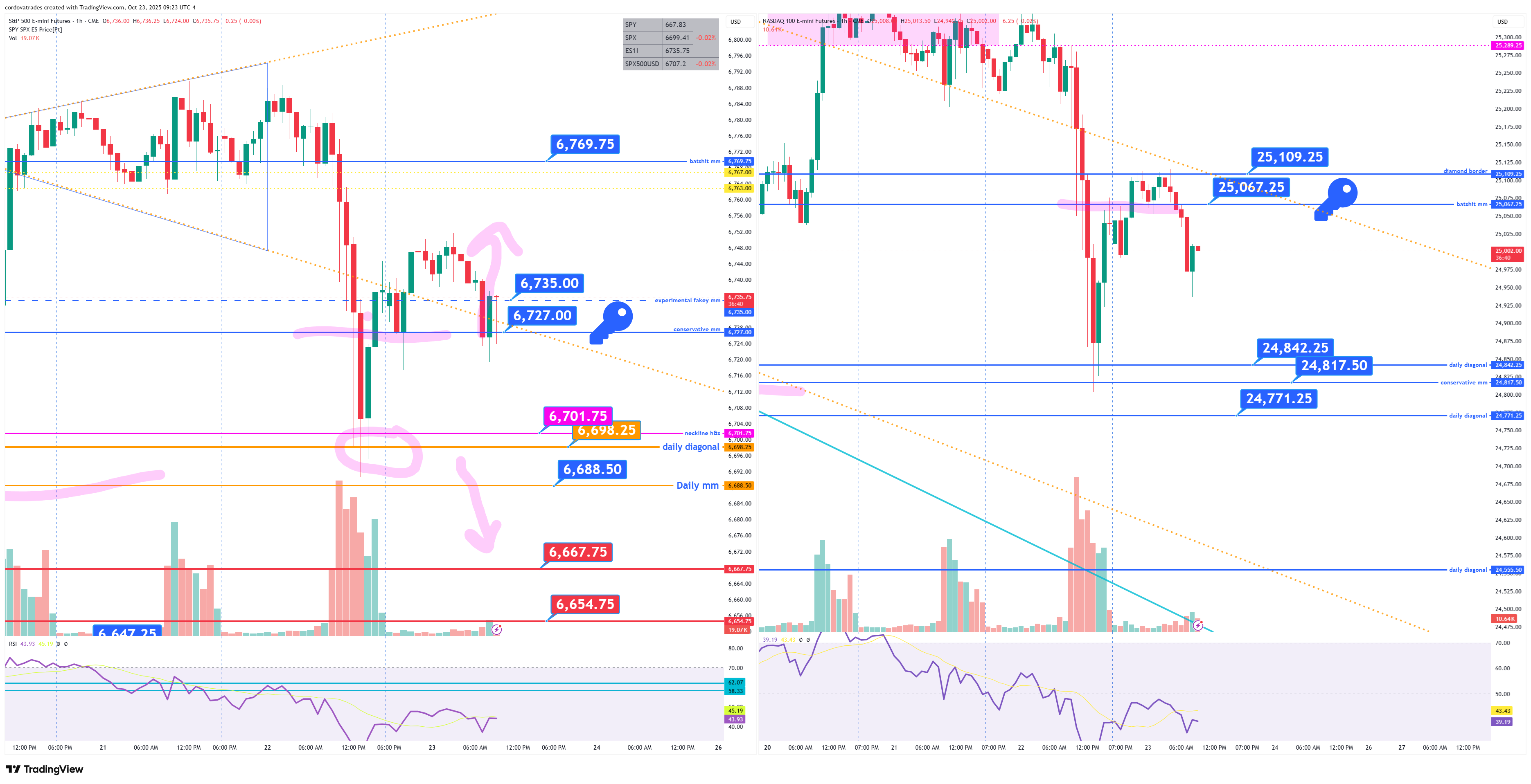 More chop aheadJulia Cordova✨Oct 23, 2025∙ PaidShareYesterday we saw a drop into daily supports for both $ES and $NQ and a nice bounce, but they aren’t out of the woods yet. Watch $ES 6727.00 and $NQ 25067.25 as keys. $GC 4hr R 4155. $CL>61.06 constructiveThis post is for paid subscribersSubscribeAlready a paid subscriber? Sign in