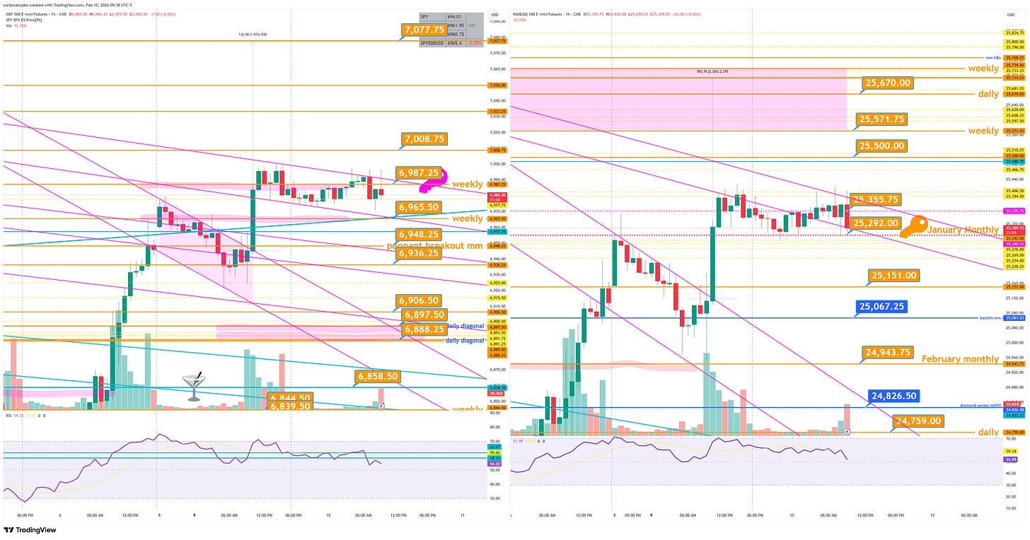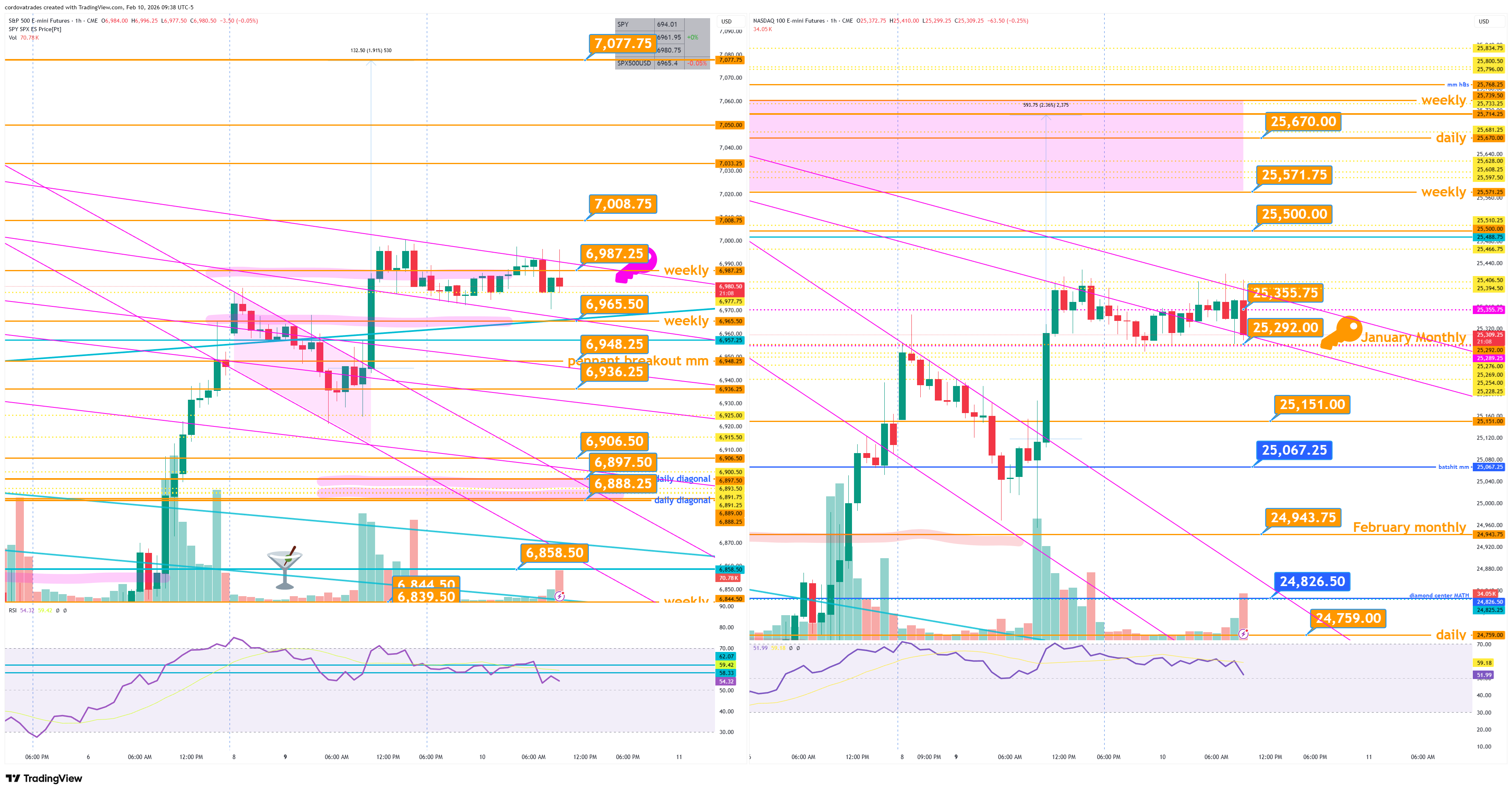 Breakout over the daily key yesterday (mm 7077.75 on hourly flag) with a close just below the weekly key and sideways chop all night. Today watch 6987.25 as key. A close above would be a big deal I believe. $NQ 25292.00. $GC 5069.3 weekly key. 5095.9 hourly R. $CL 64.58 daily key.