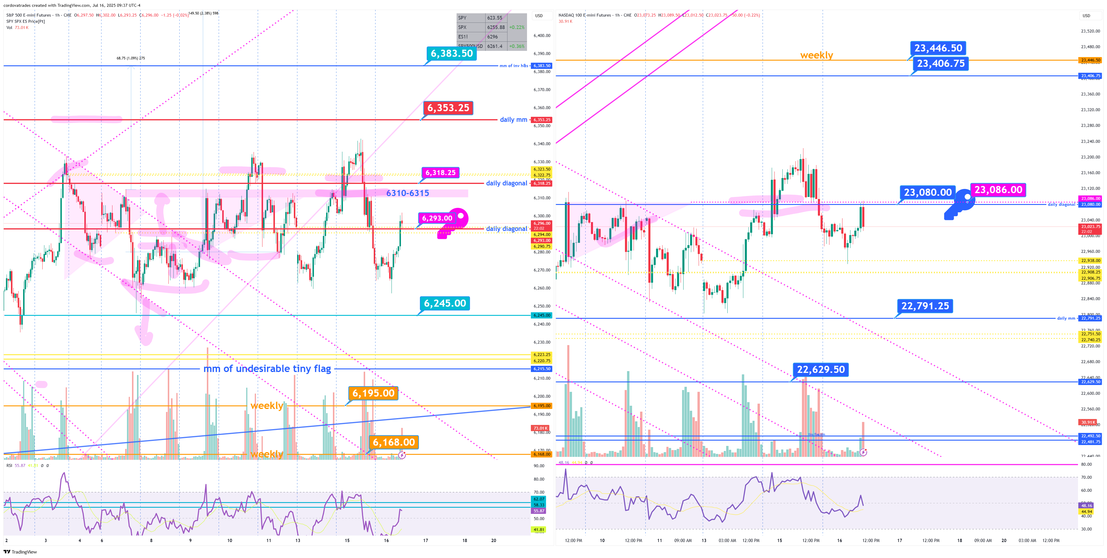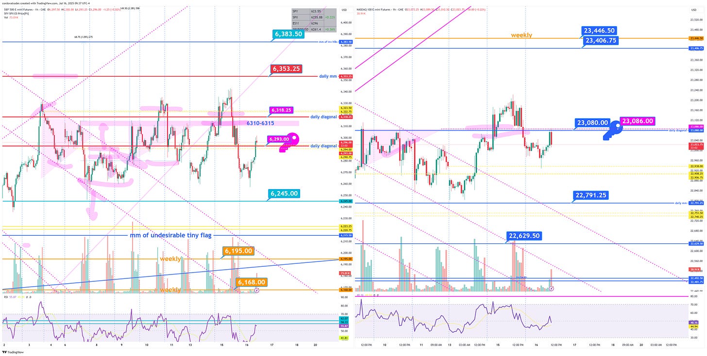 Indices continue to consolidate in what has become a 'slop chop' range. Today watch $ES 6293 for clues (bottom of ascending-ish triangle) and $NQ 23080 as the keys. $GC no bueno under 3332.5 hourly. $SI 4hr R 38.345 and generally needs to hold 38.090(hourly). $CL weekly support 65.65 (breakdown conf under). If recovers 66.35 (4hr) maybe ok.