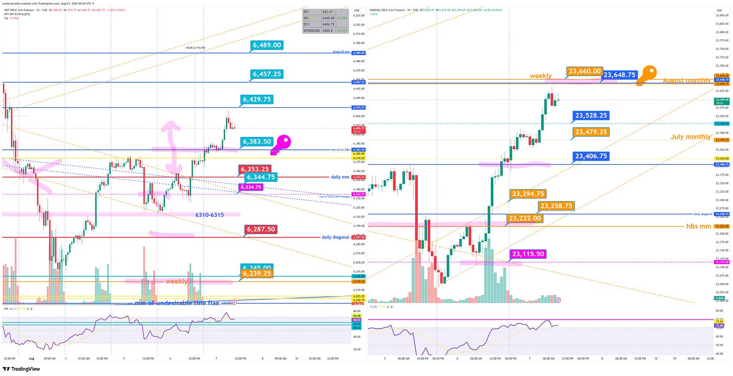 Crazy up for indices overnight. Now we are close to $NQ monthly and weekly R. Watch 23648.75-23660.00 for rejection or big breakout. $ES 6383.50 S/ 6429.75 R. $GC got 4hr flag breakout. target 3539.5 (4hr while over 3439.8) or weeklies. $SI great over 38.110(daily ascending). $CL last chance 63.43-63.69 but not good unless back over 65.65