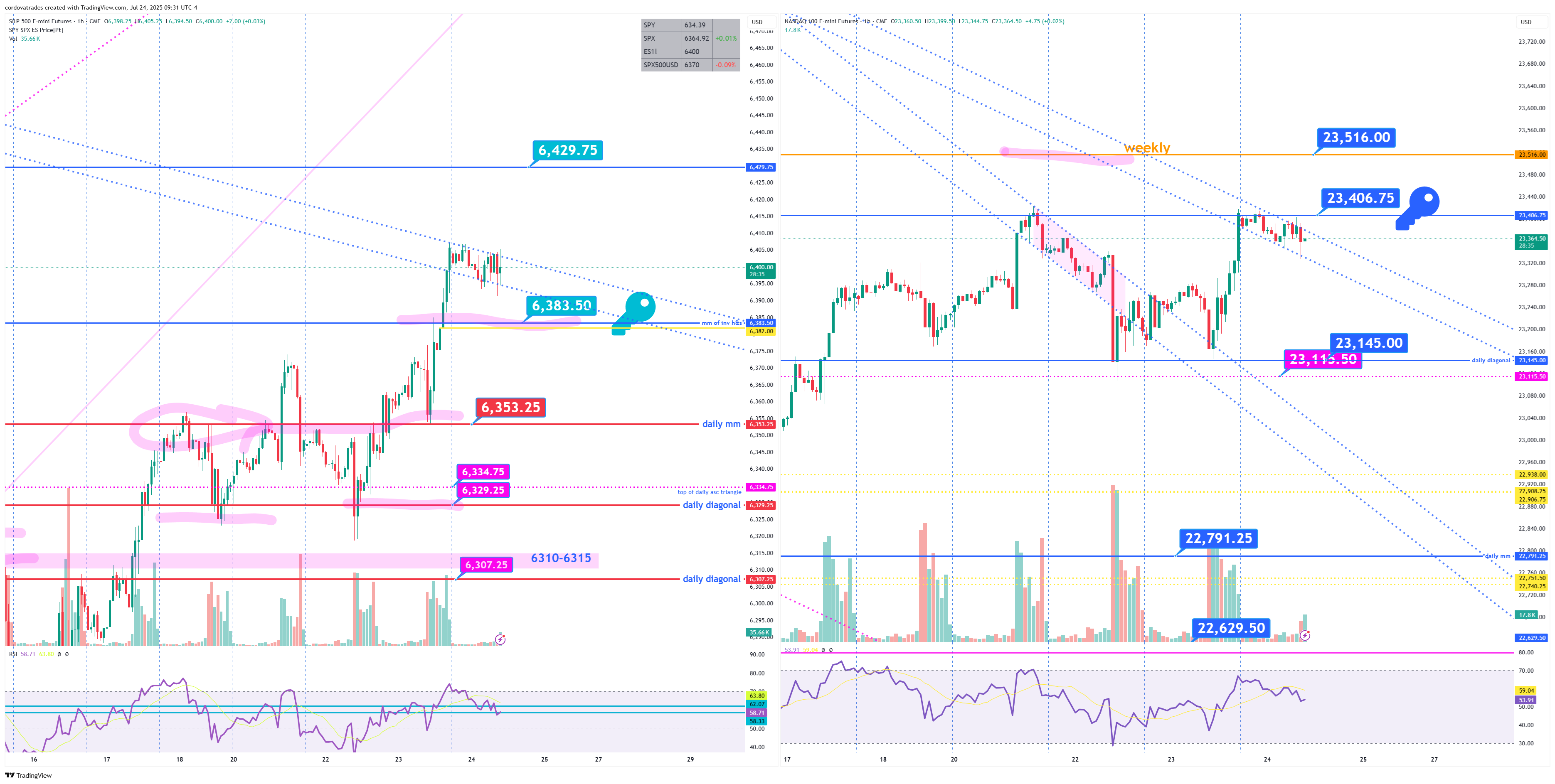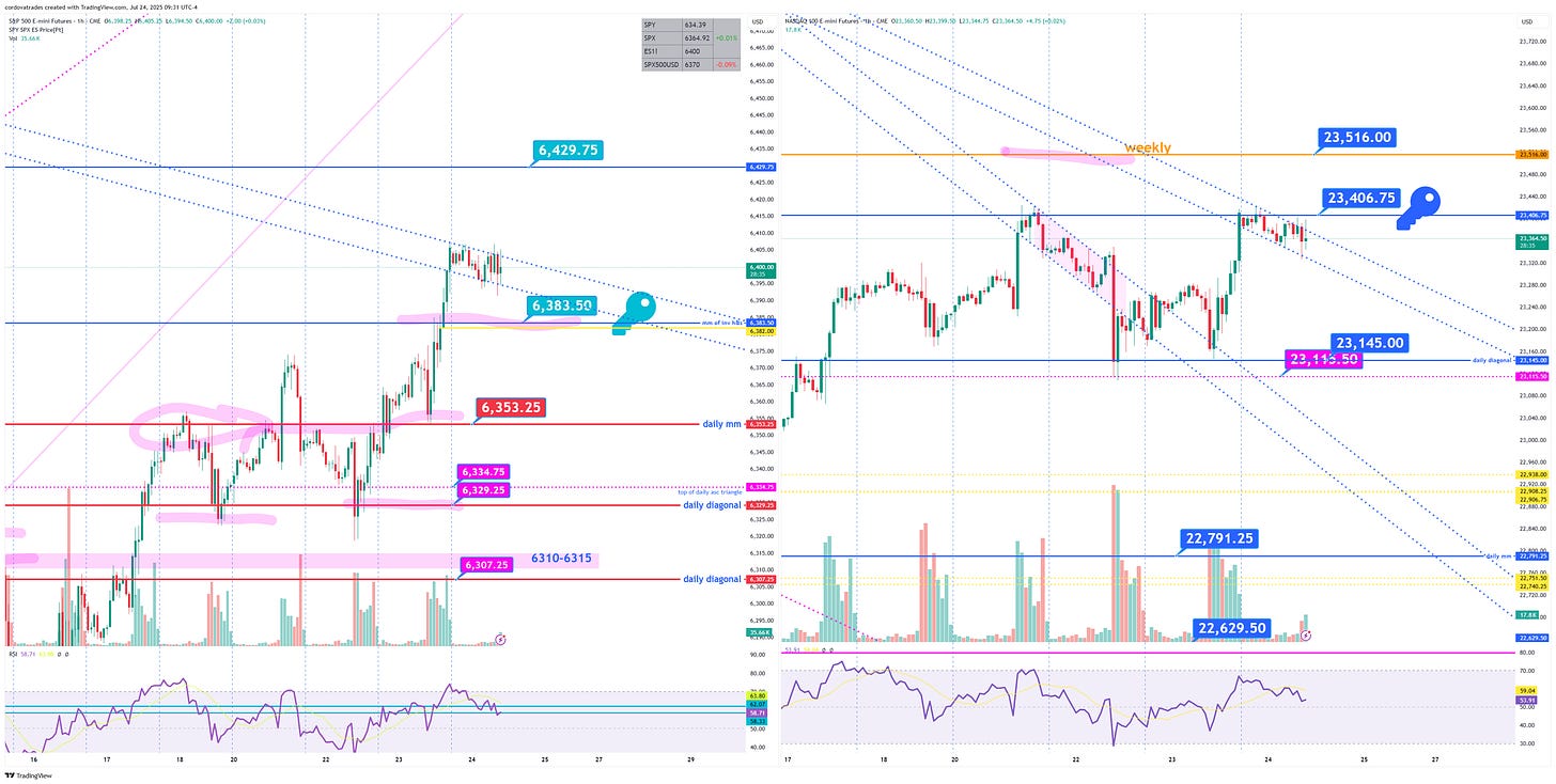 Thursday earnings unwind planJulia Cordova✨Jul 24, 2025∙ Paid21ShareBull flaggy activity for ES and NQ overnight. $ES key is 6383.50again today with closest resistance I have 6429.75. Watch $NQ 23406.75. Precious metals pullback. $GC 4hr support 3346-3355. $SI 4hr 38.945. $CL looks bullish over 65.65.This post is for paid subscribersSubscribeAlready a paid subscriber? Sign in