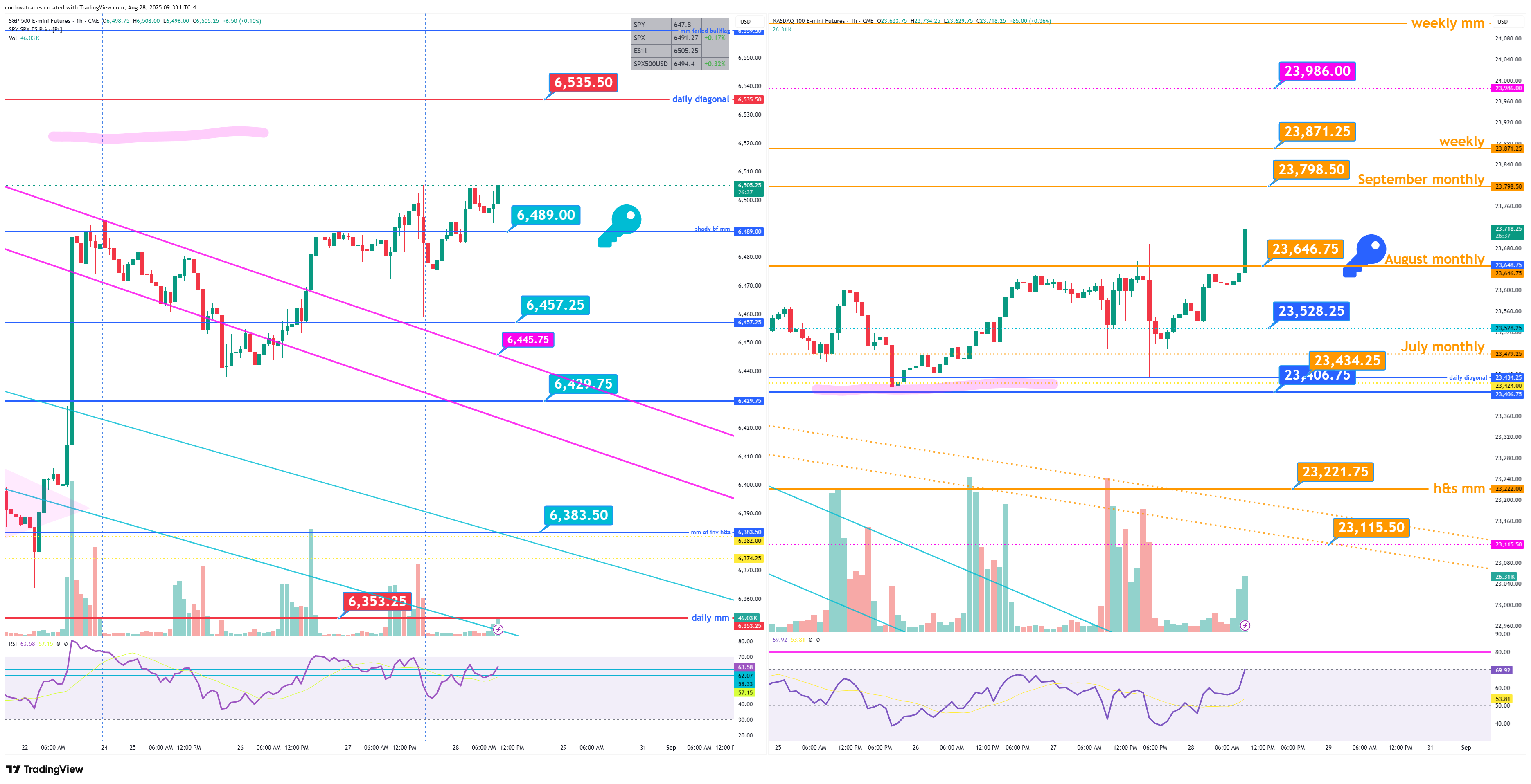 The aftermath of NVDA earnings and data is basically.... not much. 6489.00 is the $ES key for today. Watch the monthly August 23646.75 level for $NQ resistance. $GC breakout > 3457.9. $SI rolled Z contract. Breakout over 39.295. $XOP breakout over 129.82 (weekly).