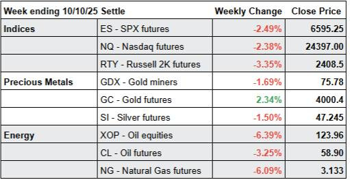 · $GDX/Gold miners also declined on the week, but held relative strength. $GC/gold futures managed to hold a gain despite $GDX/gold miners and $SI/silver futures declining for the week.