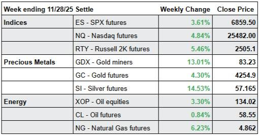 · The indices gapped up and trended up each day last week (!) resulting in an impressive rally inside a holiday shortened week. $RTY/small caps futures showed relative strength for the second week in row.