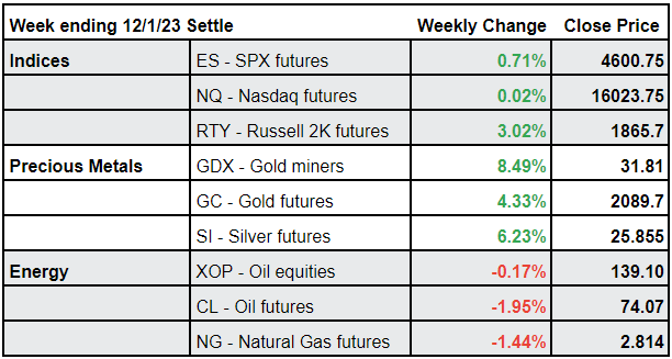 The indices spent the first 4 days of the week chop consolidating and then moved upwards on Friday. Still $ES/SPX futures closed the week only just above last and $NQ/Nasdaq futures closed essentially flat. $RTY/small caps futures, however, broke out impressively on Friday and closed close to high of day.