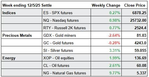 · The indices held a tight range last week, declining at the beginning of the week and then chopping upwards into Friday. $NQ/Nasdaq futures was the relative strength winner for the week, just edging out $RTY/small caps futures.