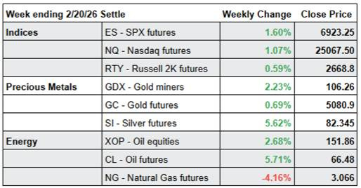 · The indices dipped during last Monday’s abbreviated holiday session and hit lows for the week on Tuesday morning. Friday settled with weekly gains across the board and $ES/SPX futures as the relative strength winner.