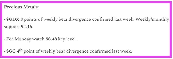 I was bearish for precious metals once again last week because of 3 pts of confirmed bearish weekly divergence for $GDX/gold miners equities.