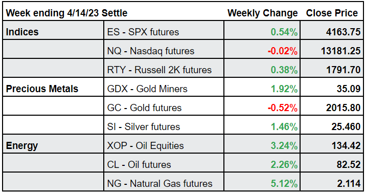 Both $CL/Crude Oil futures and $XOP/oil equities also showed higher highs and higher lows and closed the week higher.