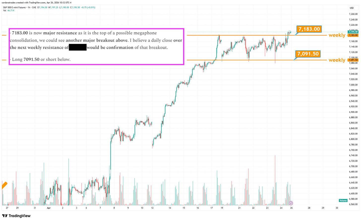 Last week I traded the consolidation levels as the rally from the bottom had very little substantial consolidation or pullback (barring the gap downs on the opens). I believed $ES/SPX futures 7183.00 to be major weekly resistance and 7091.50 to be the next weekly support:
