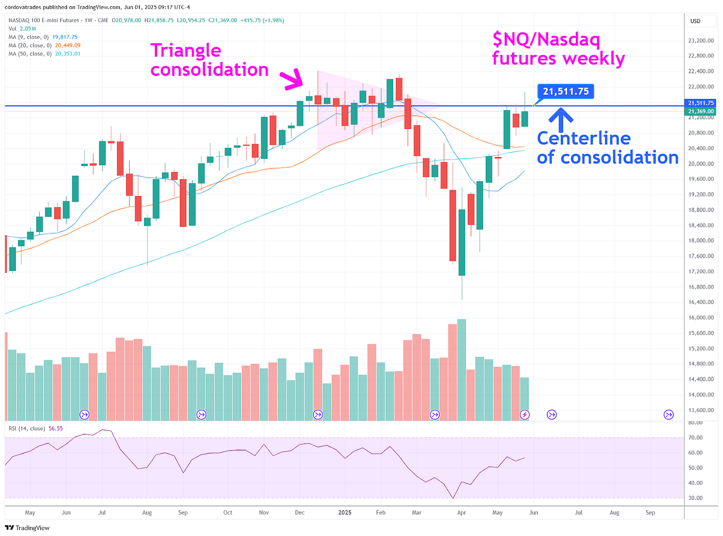 Perhaps the most important level I’ve been watching/trading over the past few weeks has been $NQ/Nasdaq futures 21511.75. That level remains a constant on my weekly chart as it’s the center of an old triangle consolidation. I have found that algos respect those center levels as support/resistance very well and we can see that to be the case here: