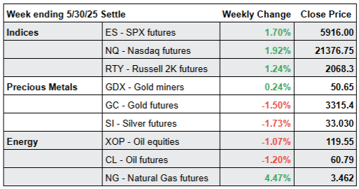 Indices opened the holiday week strong last week, peaking on Thursday in the overnight session. Friday’s end of month daily candles continued to show a ‘buy the dip’ pattern. $RTY/Small caps futures continued to lag, while $NQ/Nasdaq futures was the relative strength winner by a small margin.