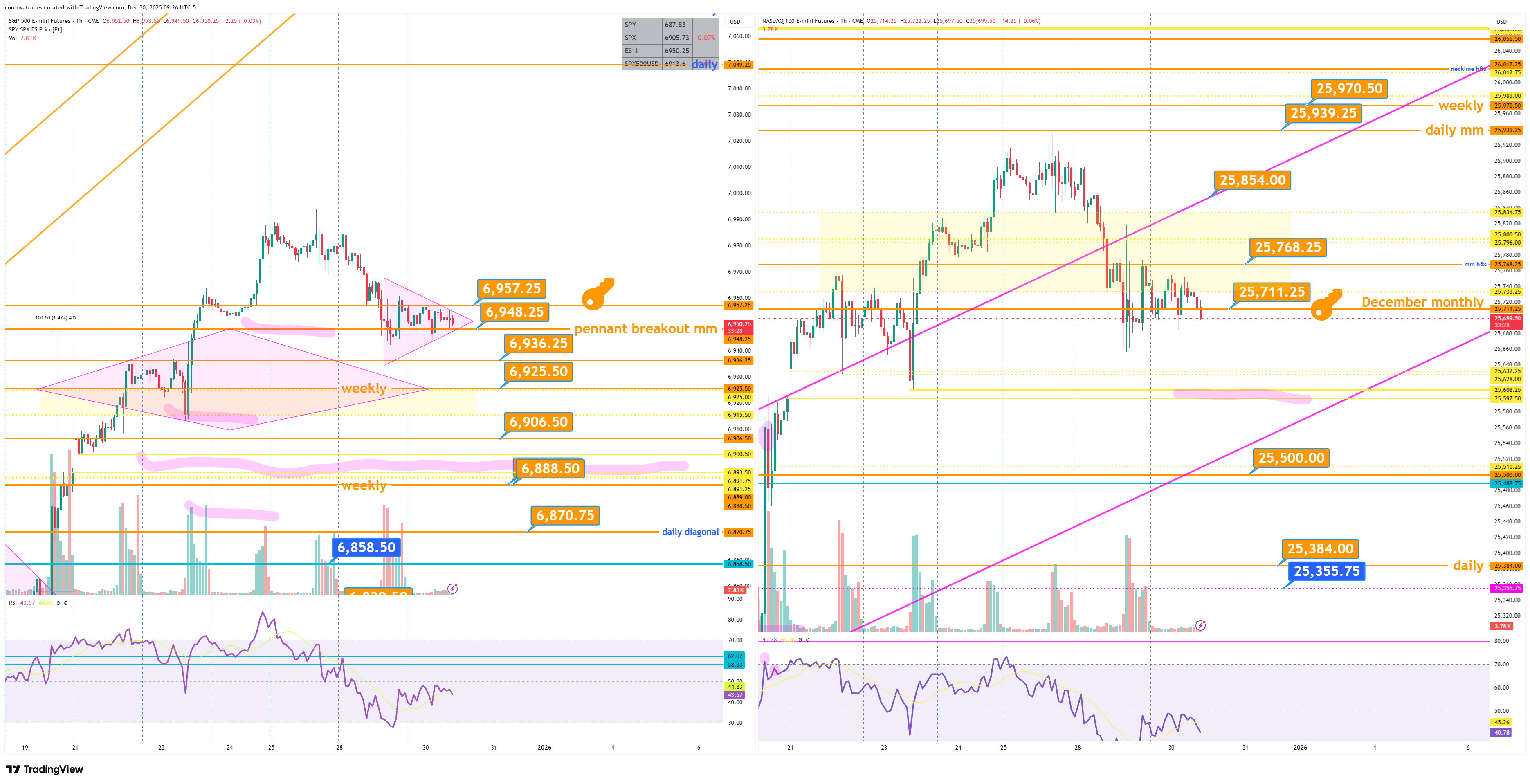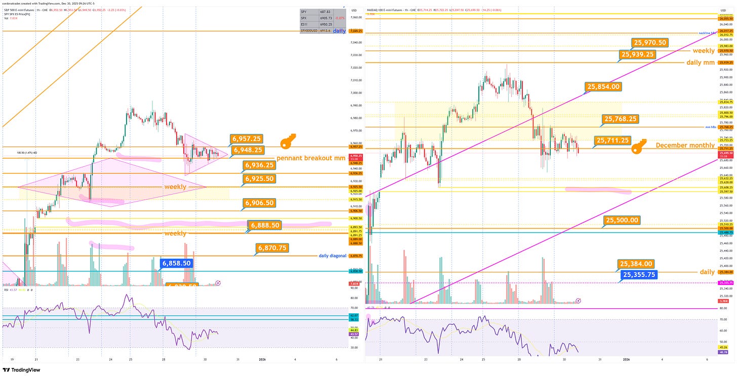 Triangle timeJulia Cordova✨Dec 30, 2025∙ PaidShareBoth $ES and $NQ look to be forming triangles on the hourly. Same keys as yesterday: $ES key is 6957.25. $NQ 25711.25. $GC possible bear flag hourly R 4409.5. $SI S 74.12. $XOP watch 124.64, 125.54, 129.82.This post is for paid subscribersSubscribeAlready a paid subscriber? Sign in