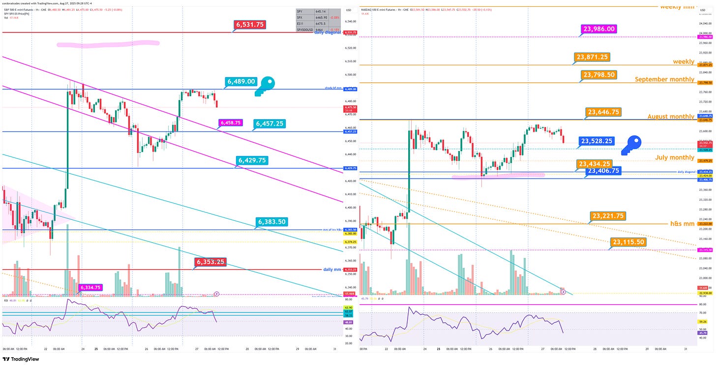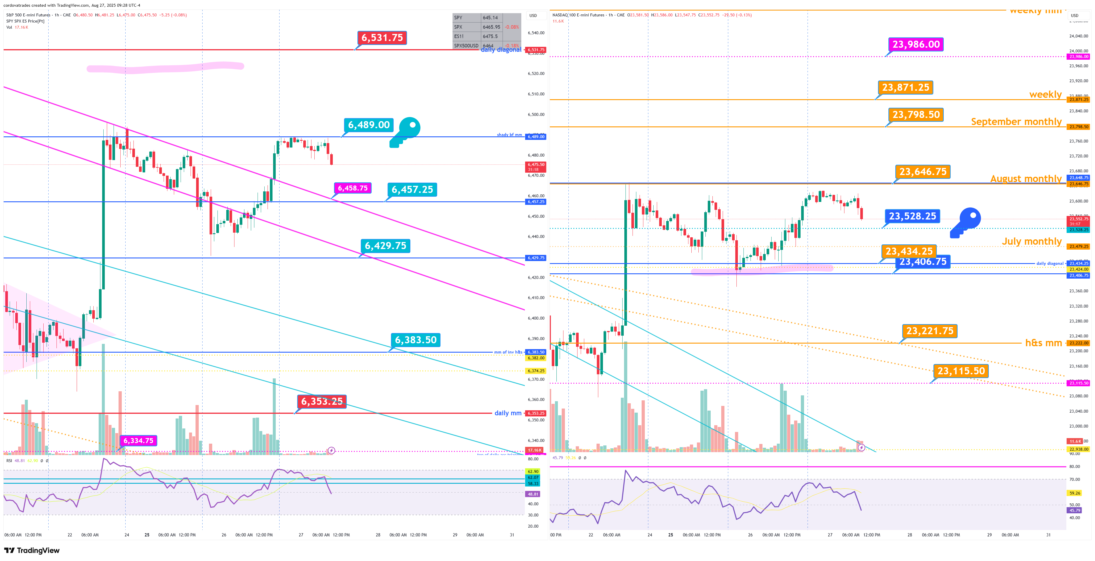 I see what could be a messy inverse h&s forming on $ES and $NQ. For today watch 6489 as the key (breakout above) and underneath 6457.25 would be a breakdown. $NQ 23528.25. Upeard channel on $GC 4hr. 3421.9 S and another 4hr close> 3439.8 would be constructive. $SI watch 38.43R (hourly) /38.195S (4hr). 63.69 $CL.