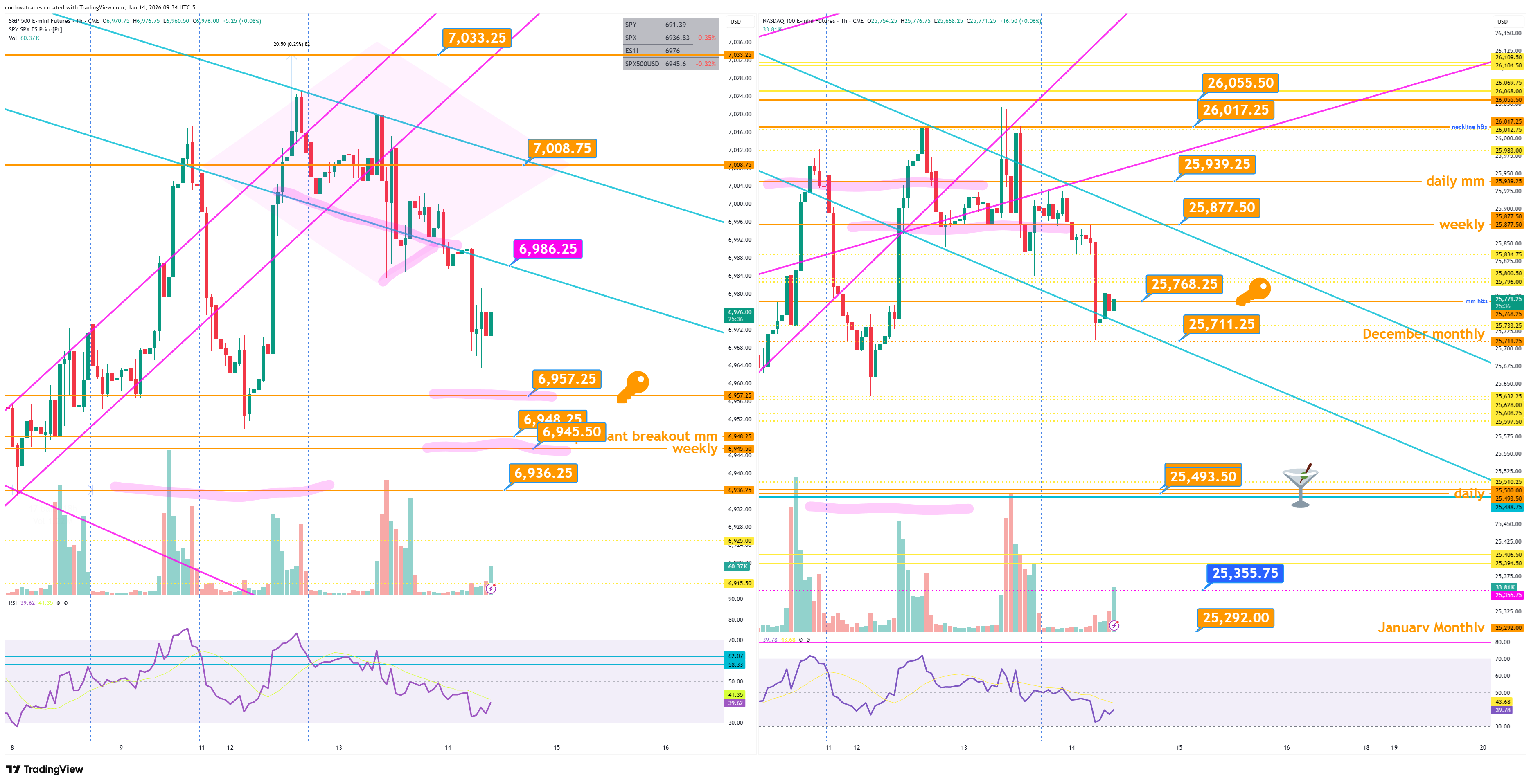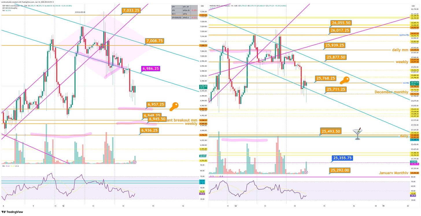 Wednesday PlanJulia Cordova✨Jan 14, 2026∙ Paid11ShareIndices broke down overnight. For today watch $ES 6957.25 and $NQ 25768.25 as the keys. POSSIBLE SC decision at 10am so be careful. $GC 4644.4 important. $SI broke out again overnight, 1hr support 91.335. Next big R 95.195. $CL 61.06 S.This post is for paid subscribersSubscribeAlready a paid subscriber? Sign in