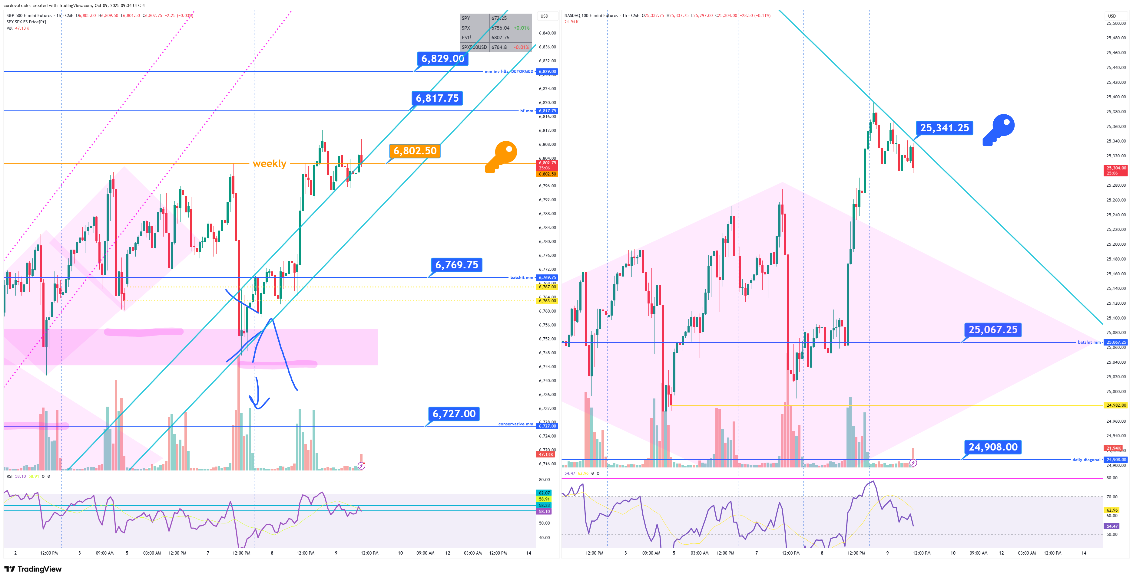 Will it or won't itJulia Cordova✨Oct 09, 2025∙ Paid1ShareYesterday $ES held just under the weekly 6802.50 (BARELY), but then formed a triangular consolidation all night. Watch that same level for a breakout/fakey breaky today. $GC 4072.7 4hr. $CL 61.06 S, 63.69 R.This post is for paid subscribersSubscribeAlready a paid subscriber? Sign in